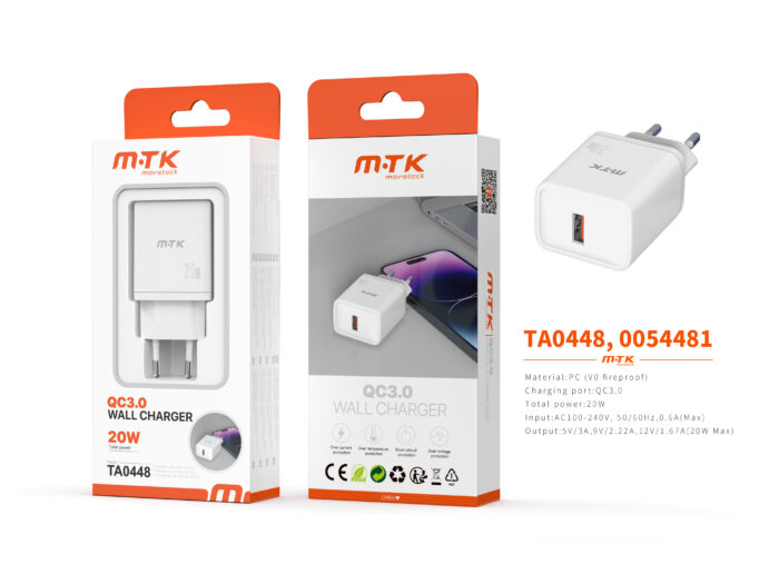 • TA0345 BL Cargador Rapido de Pared Marga Sin cable , Entrada Type-C(PD)+QC3.0)/20W/3.4A Max , Blanco