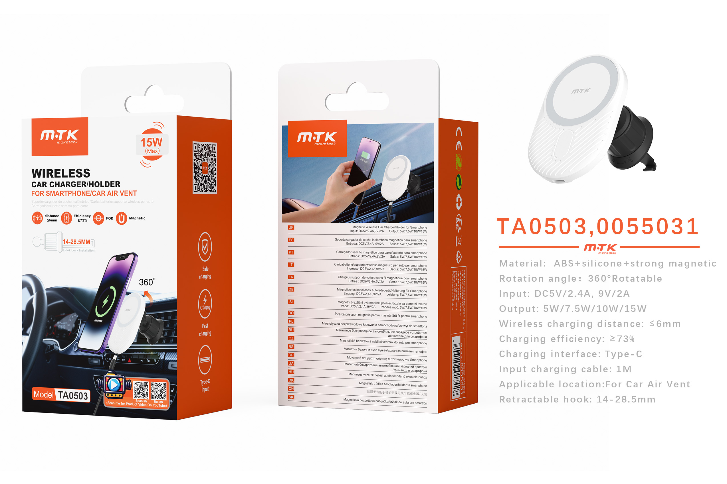 TA0503 BL Soporte Universal Magnetico de movil para airvent de coche, Soporta Carga Inalambrico 15W y giro 360°, Blanco