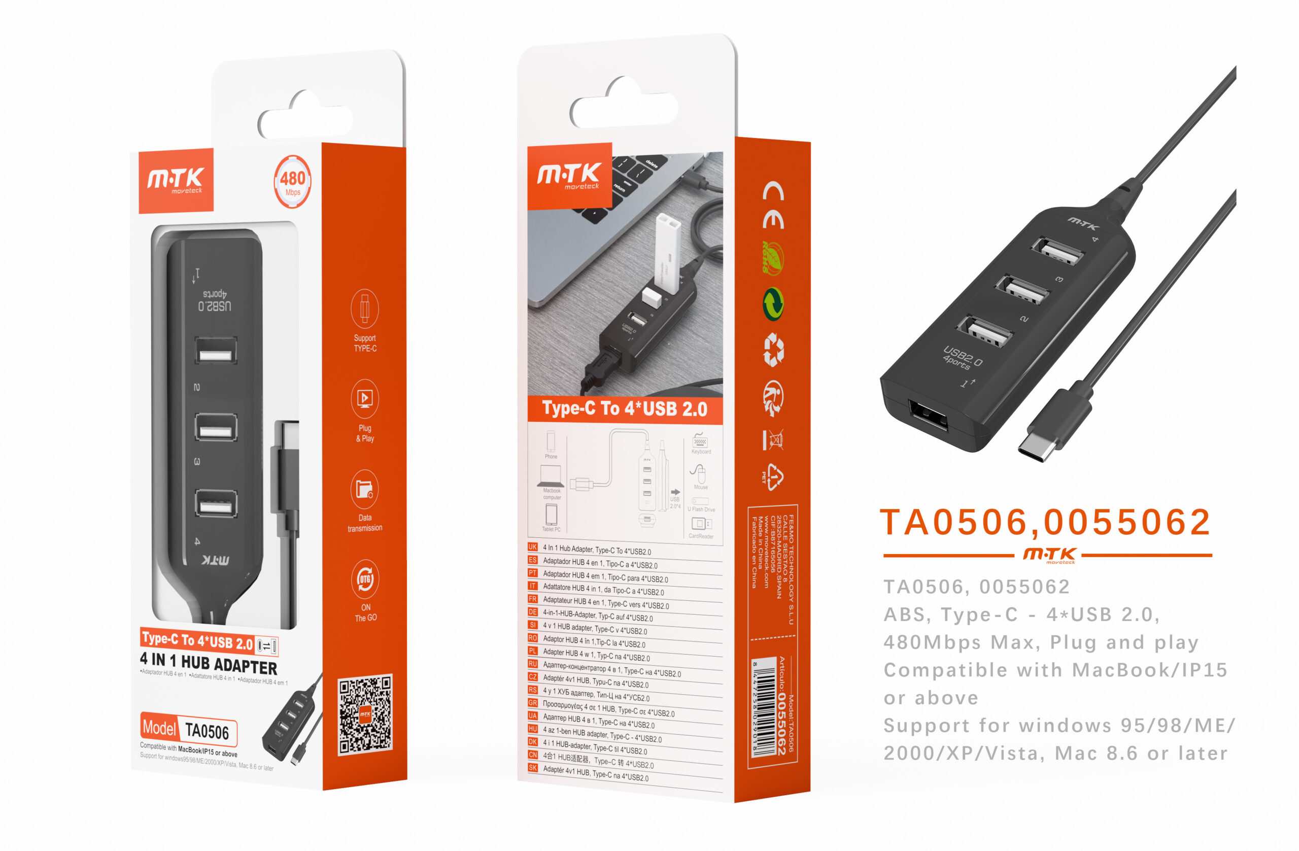 TA0506 NE Hubs Type-C con 4 Puertos USB 2.0, 480Mbps, Negro