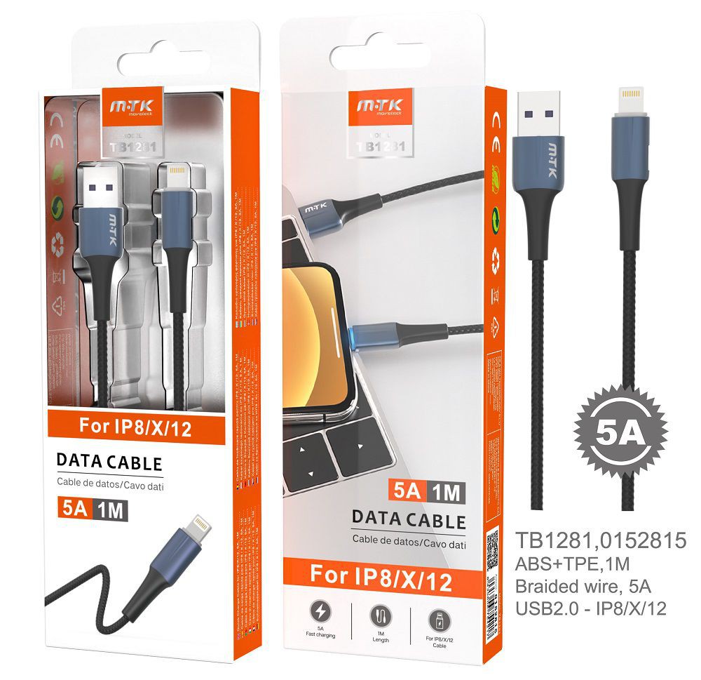 TB1281 AZ Cable de Datos Metal Sword para IP 5-12, Cable Nylon trenzado con Luz LED Azul, 1M, 5A, Azul