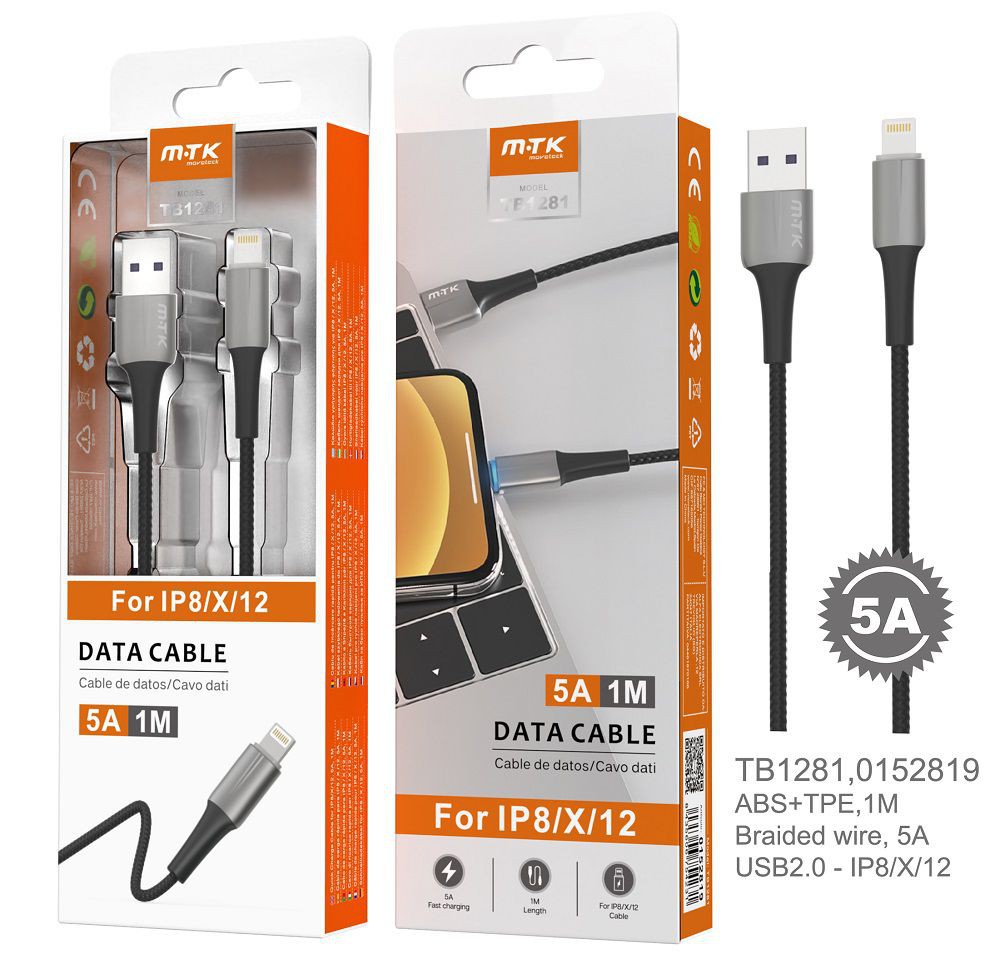 TB1281 GR Cable de Datos Metal Sword para IP 5-12, Cable Nylon trenzado con Luz LED Azul, 1M, 5A, Gris