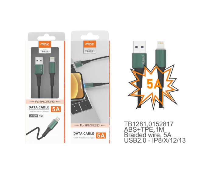 TB1281 VE Cable de Datos Metal Sword para IP 5-12, Cable Nylon trenzado con Luz LED Azul, 1M, 5A, Verde