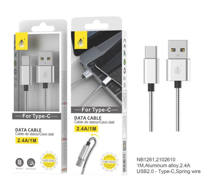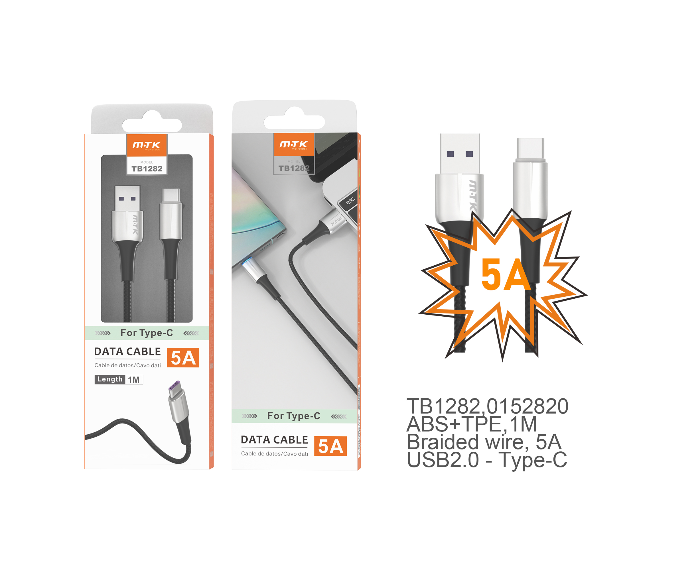 TB1282 PL Cable de Datos Metal Sword para Type C, Cable Nylon trenzado con Luz LED Azul, 1M, 5A, Plata