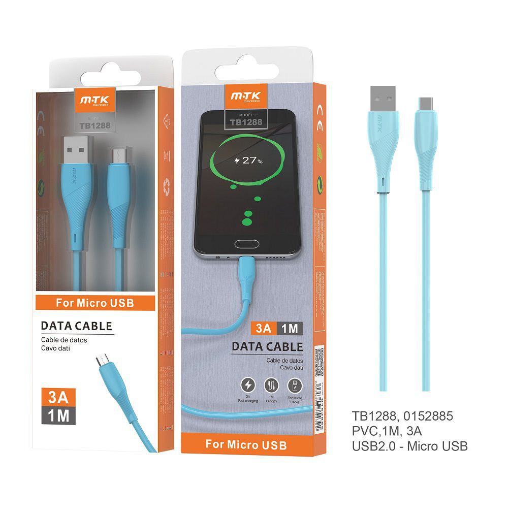 TB1288 AZ Cable de datos PVC Venus para Micro USB, 1M, 3A AZUL