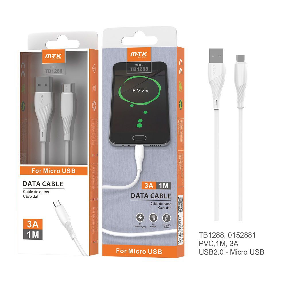 TB1288 BL Cable de datos PVC Venus para Micro USB, 1M, 3A BLANCO