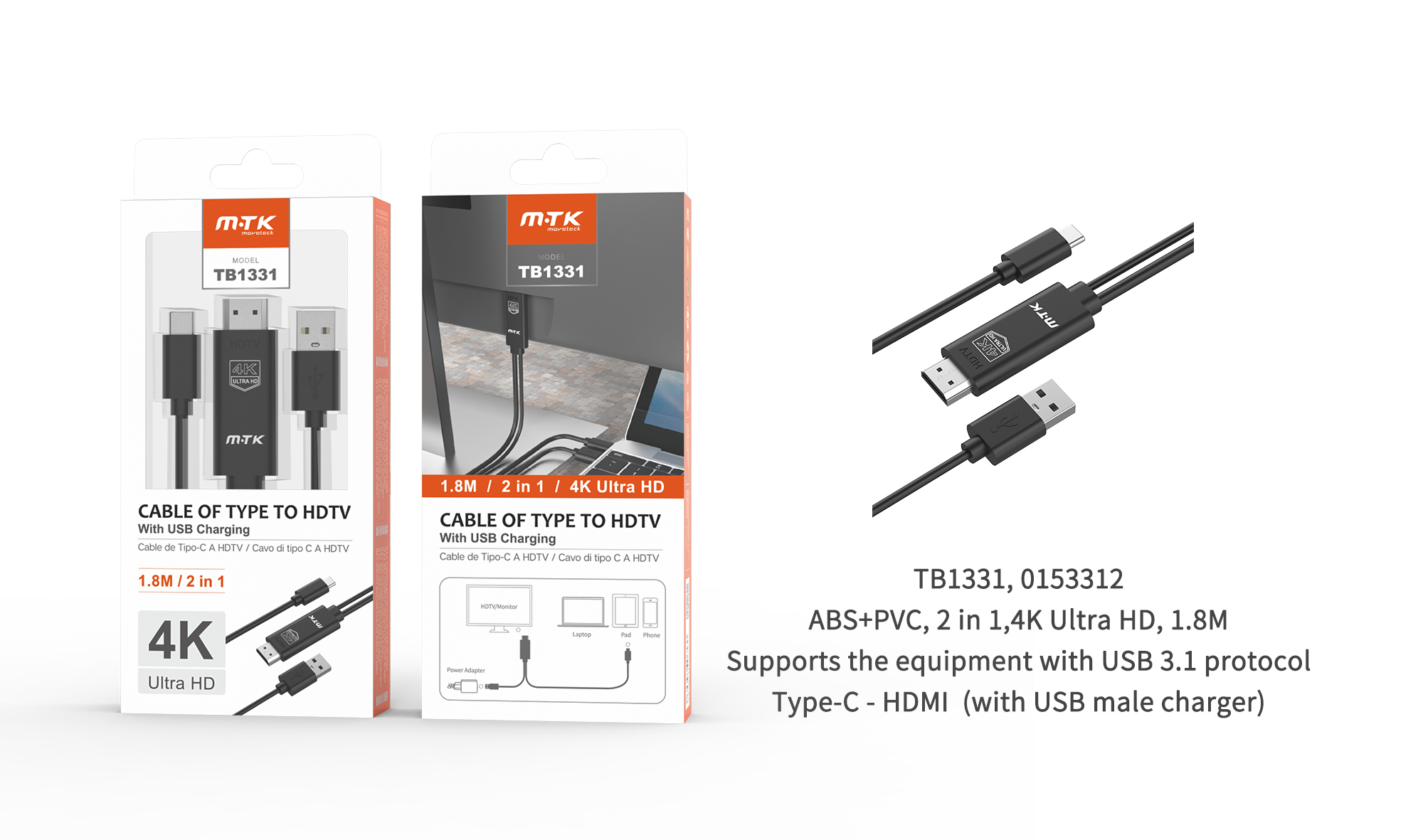 TB1331 NE Adaptador Type-C a HDMI Ultra 4K (Soportado dispositivo USB 3.1+),Cable 1.8m,Negro