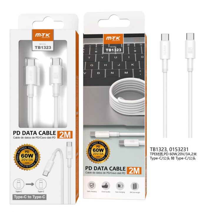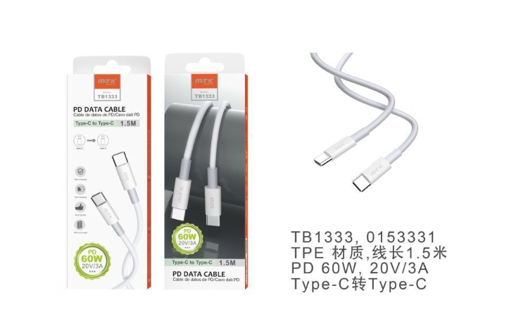 TB1333  BL Cable de Datos Siro , Type-C a Type-C ,  Carga Rapida PD 60W 20v/3A ,Cable 1.5M ,Blanco