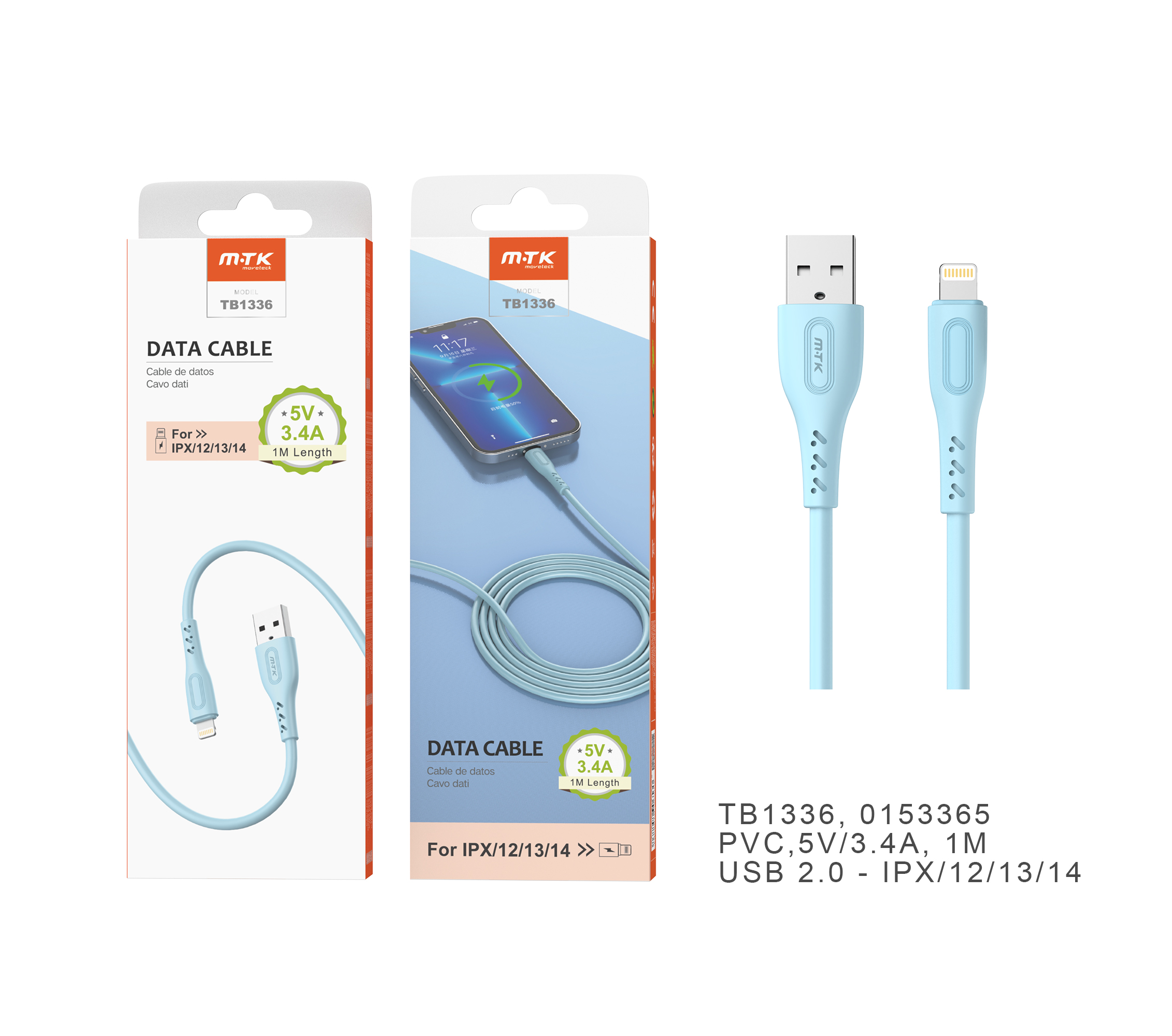 TB1336 AZ Cable de datos Clea para Iphone 5-14 , 5V/3.4A, 1M , Azul
