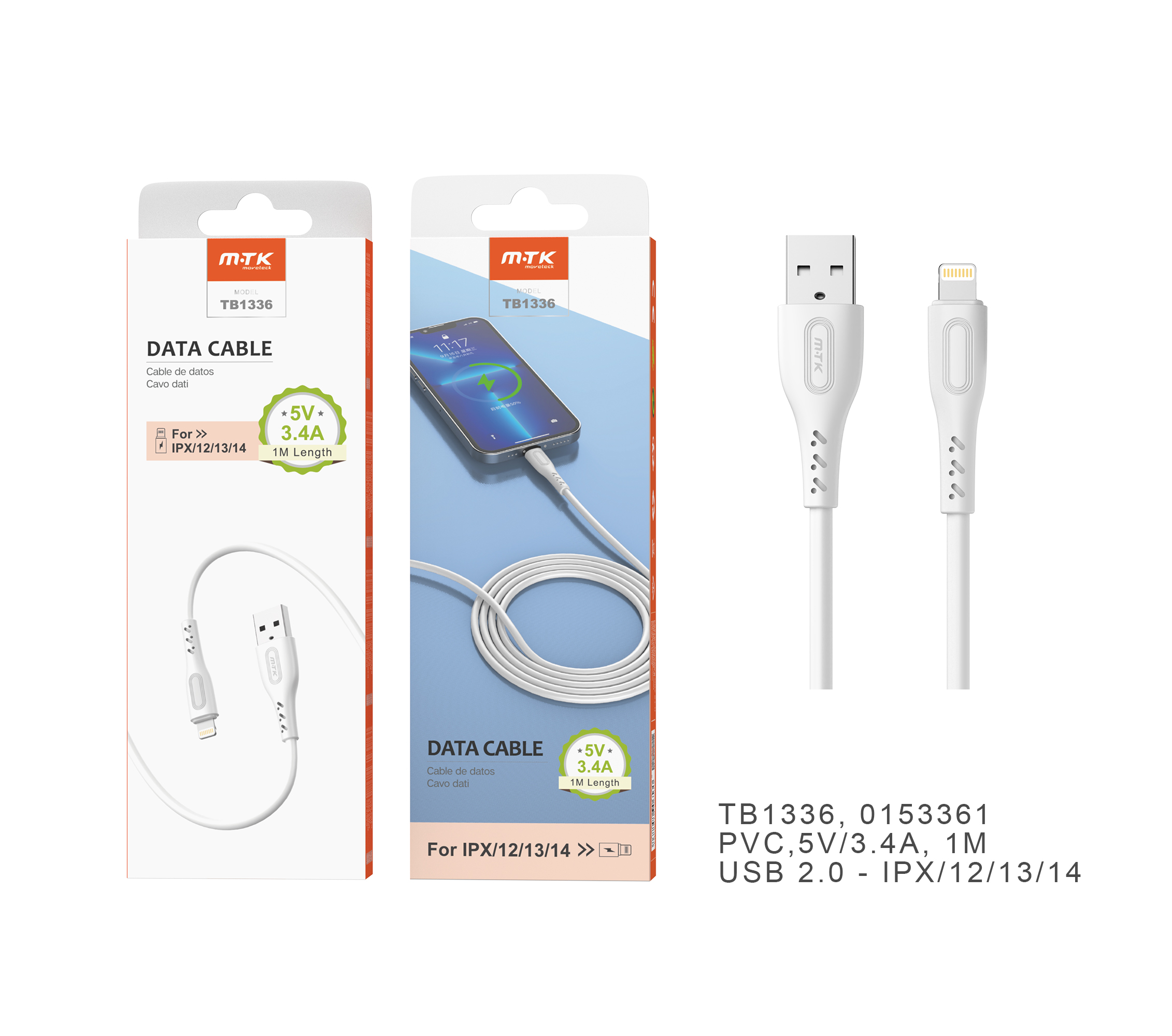 TB1336 BL Cable de datos Clea para Iphone 5-14 , 5V/3.4A, 1M , Blanco