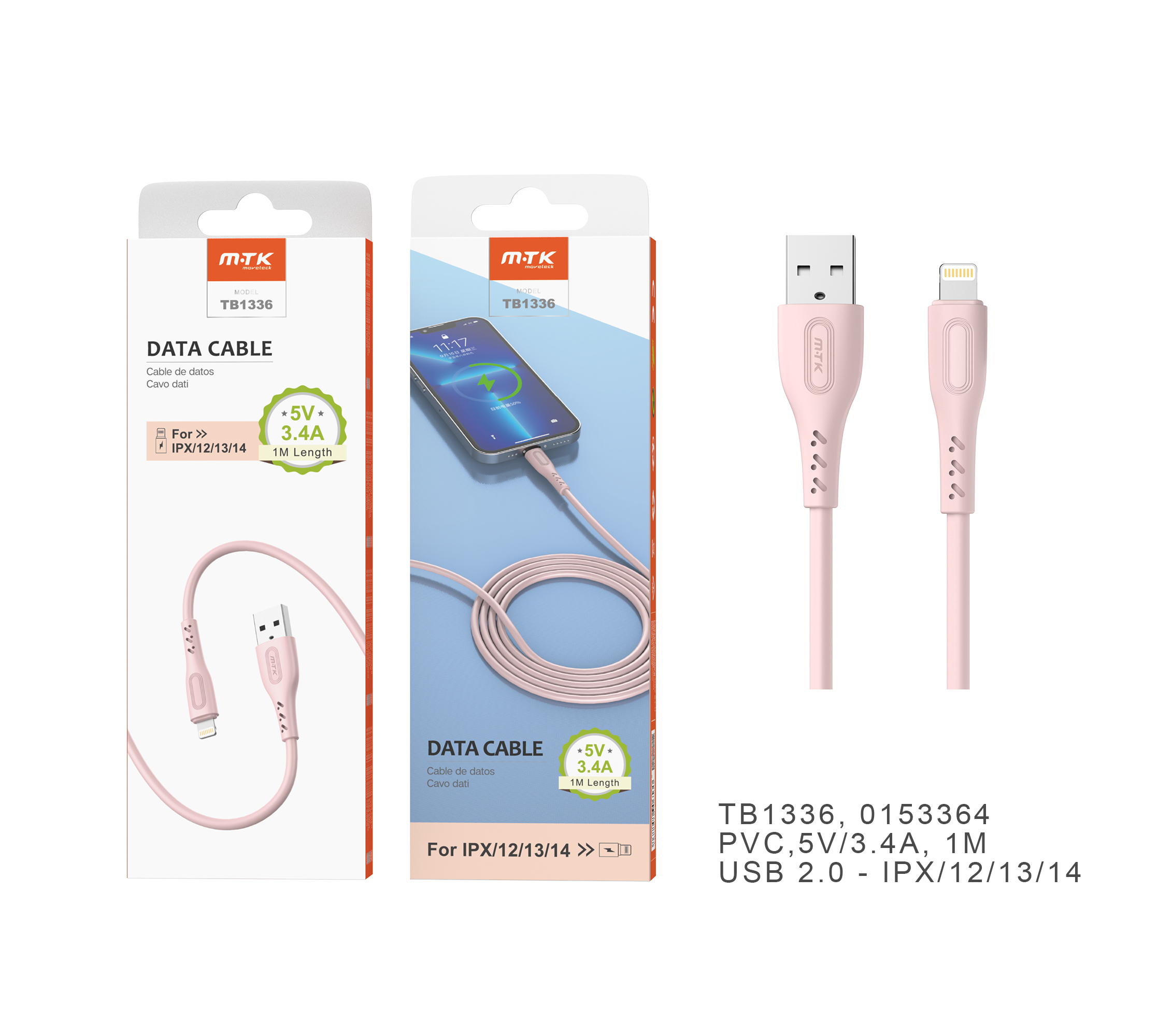 TB1336 RS Cable de datos Clea para Iphone 5-14 , 5V/3.4A, 1M , Rosa