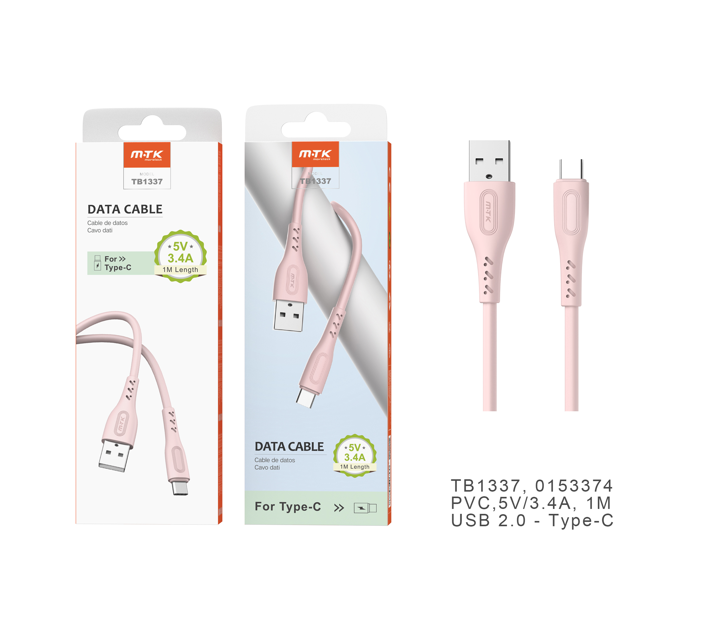 TB1337 RS Cable de datos Clea para Type-C , 5V/3.4A, 1M , Rosa