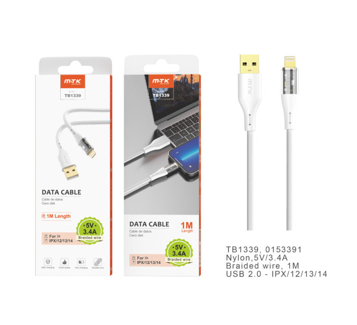 TB1339 BL Cable de datos Smith nylon trenzado para Iphone 5-14 , 5V/3.4A, 1M, Blanco
