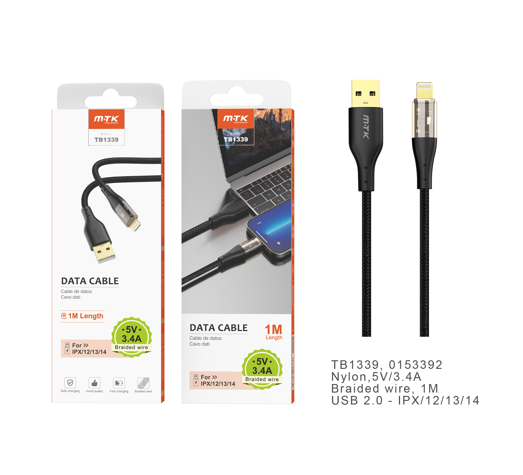 TB1339 NE Cable de datos Smith nylon trenzado para Iphone 5-14 , 5V/3.4A, 1M, Negro