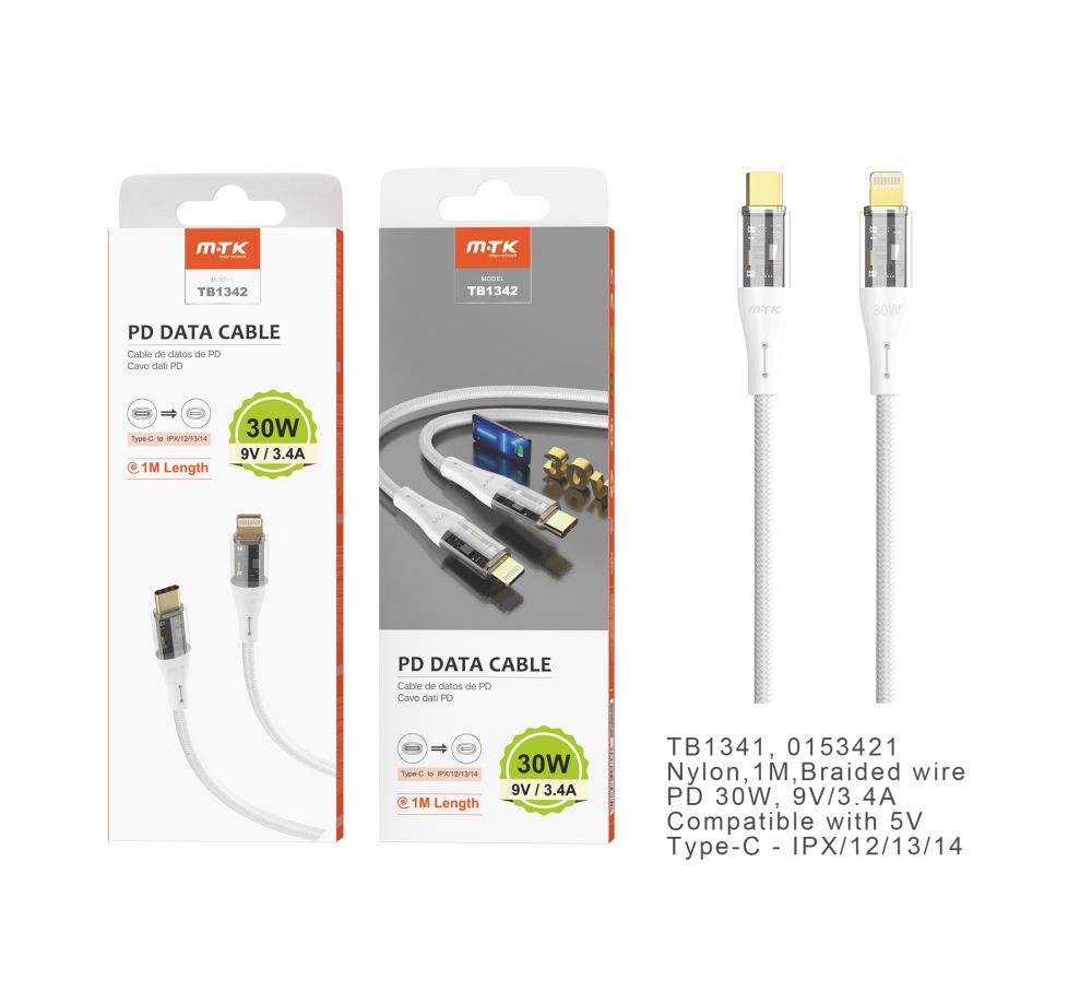 TB1342 BL Cable de datos Smith nylon trenzado para Type-C a Lightning , Carga Rapida PD,30W/9V/3.4A, 1M, Blanco