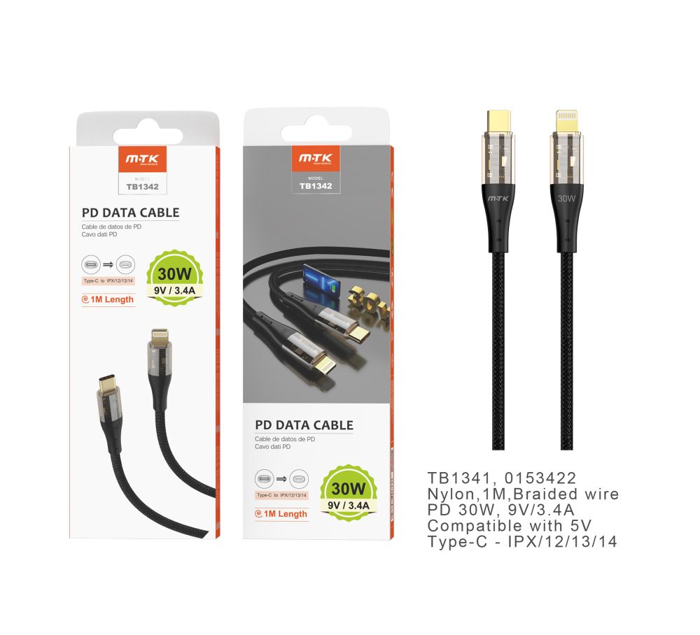 TB1342 NE Cable de datos Smith nylon trenzado para Type-C a Lightning , Carga Rapida PD,30W/9V/3.4A, 1M, Negro