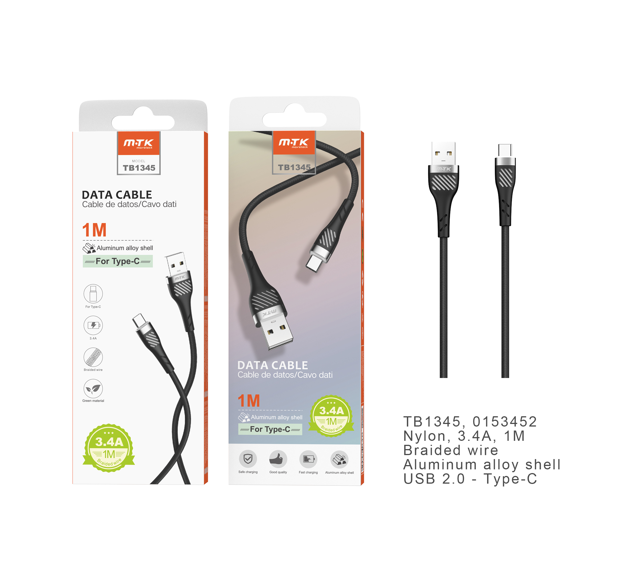 TB1345 NE Cable de datos Camyl nylon trenzado para Type-C, 3.4A, 1M, Negro
