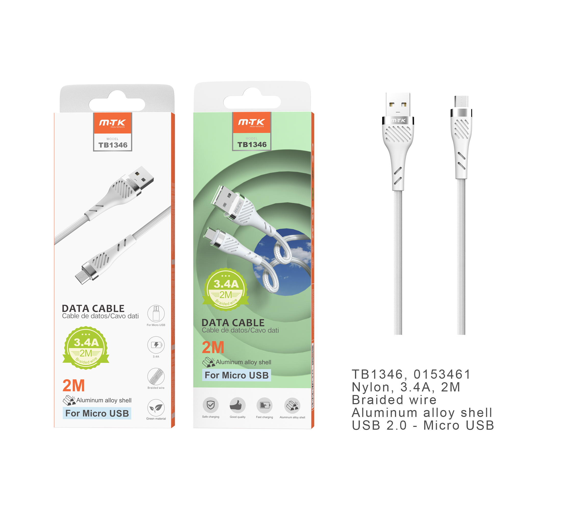 TB1346 BL Cable de datos Camyl nylon trenzado para Micro USB, 2.4A, 2M, Blanco