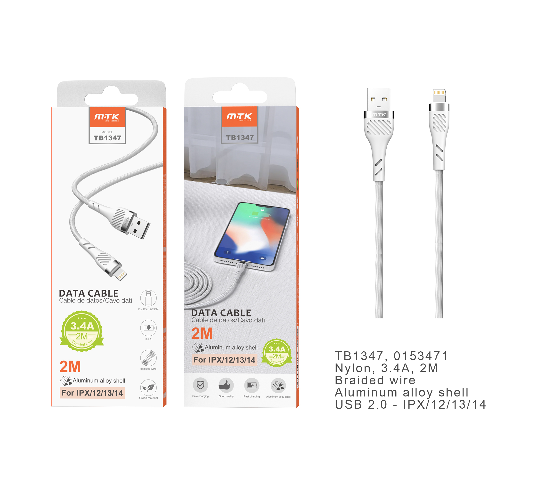TB1347 BL Cable de datos Camyl nylon trenzado para Iphone, 2.4A, 2M, Blanco