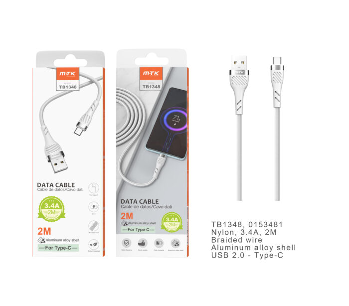 TB1348 BL Cable de datos Camyl nylon trenzado para Type-C, 2.4A, 2M, Blanco