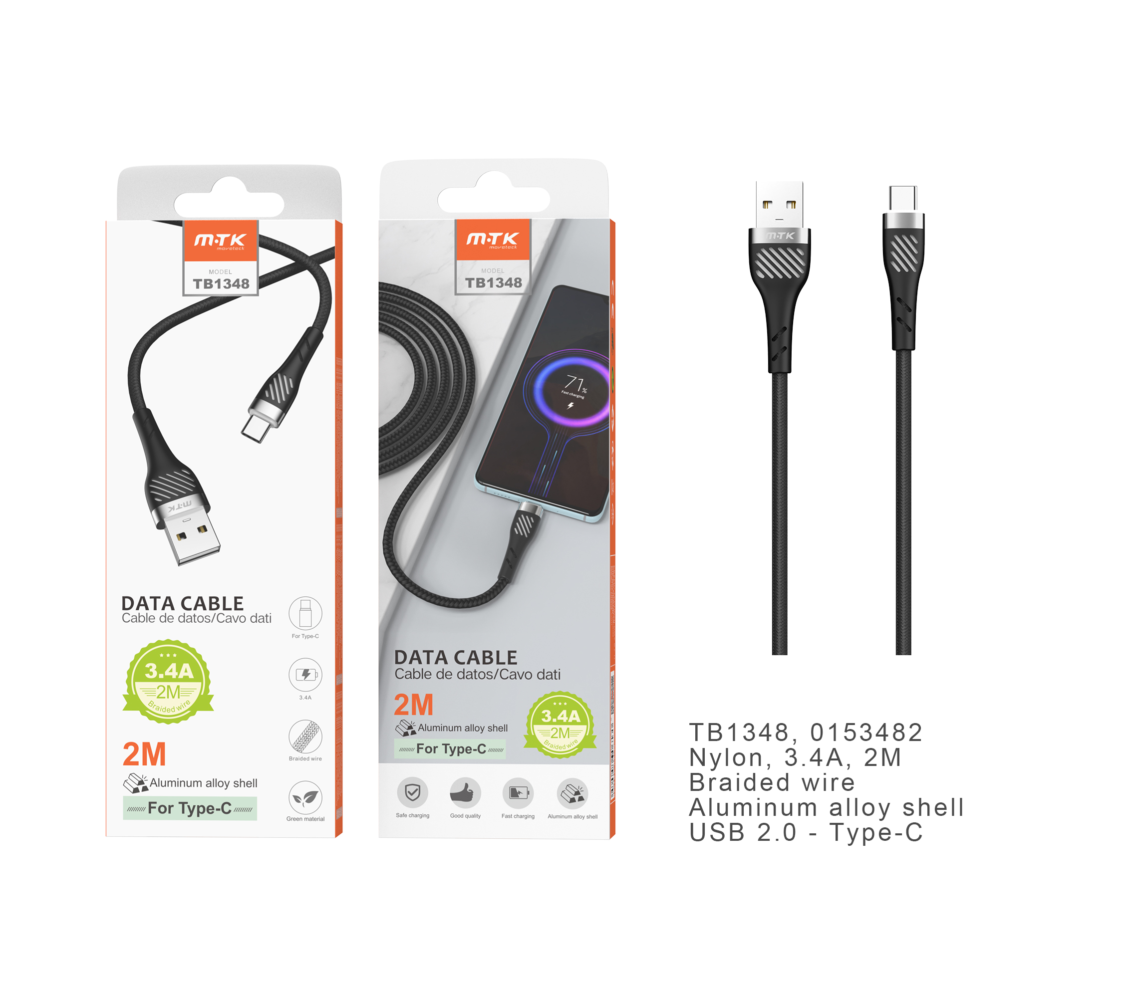 TB1348 NE Cable de datos Camyl nylon trenzado para Type-C, 2.4A, 2M, Negro
