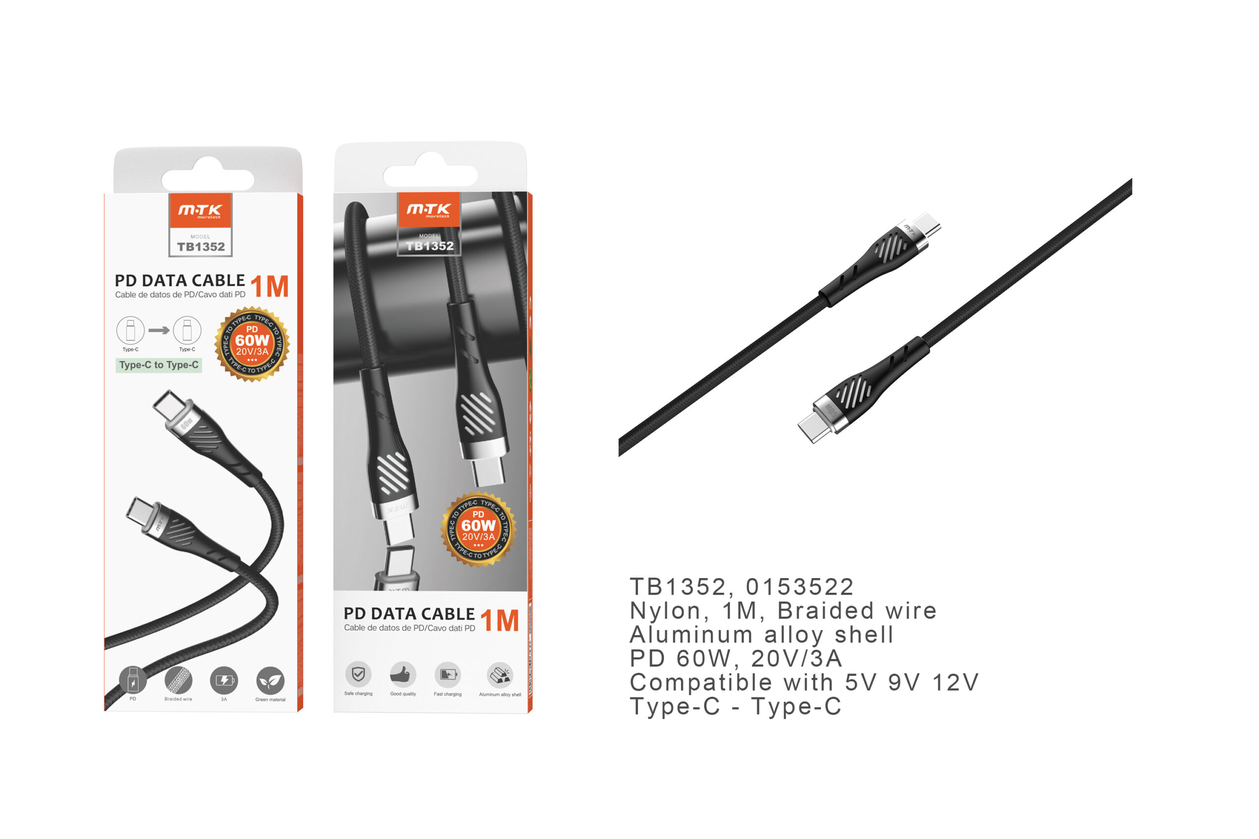 TB1352 NE Cable de Datos Camyl nylon trenzado , Type-C a Type-C ,Carga Rapida PD 60W/20V/3A , Cable 1M , Negro
