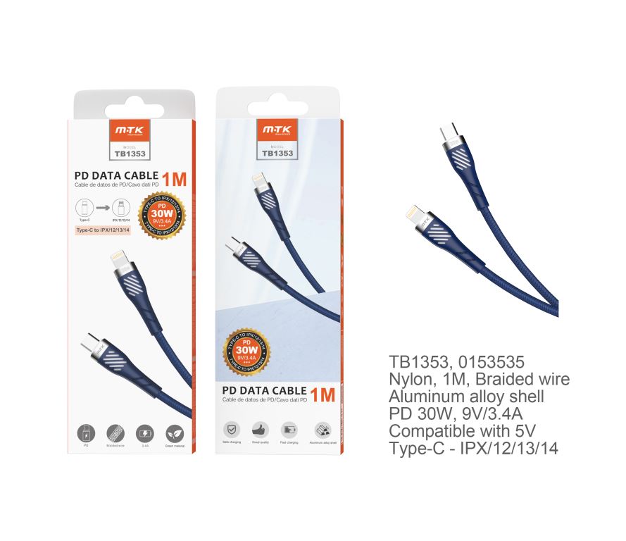 TB1353 AZ Cable de Datos Camyl nylon trenzado , Type-C a Lightning , Carga Rapida PD 30W/9V/3.4A , Cable 1M , Azul