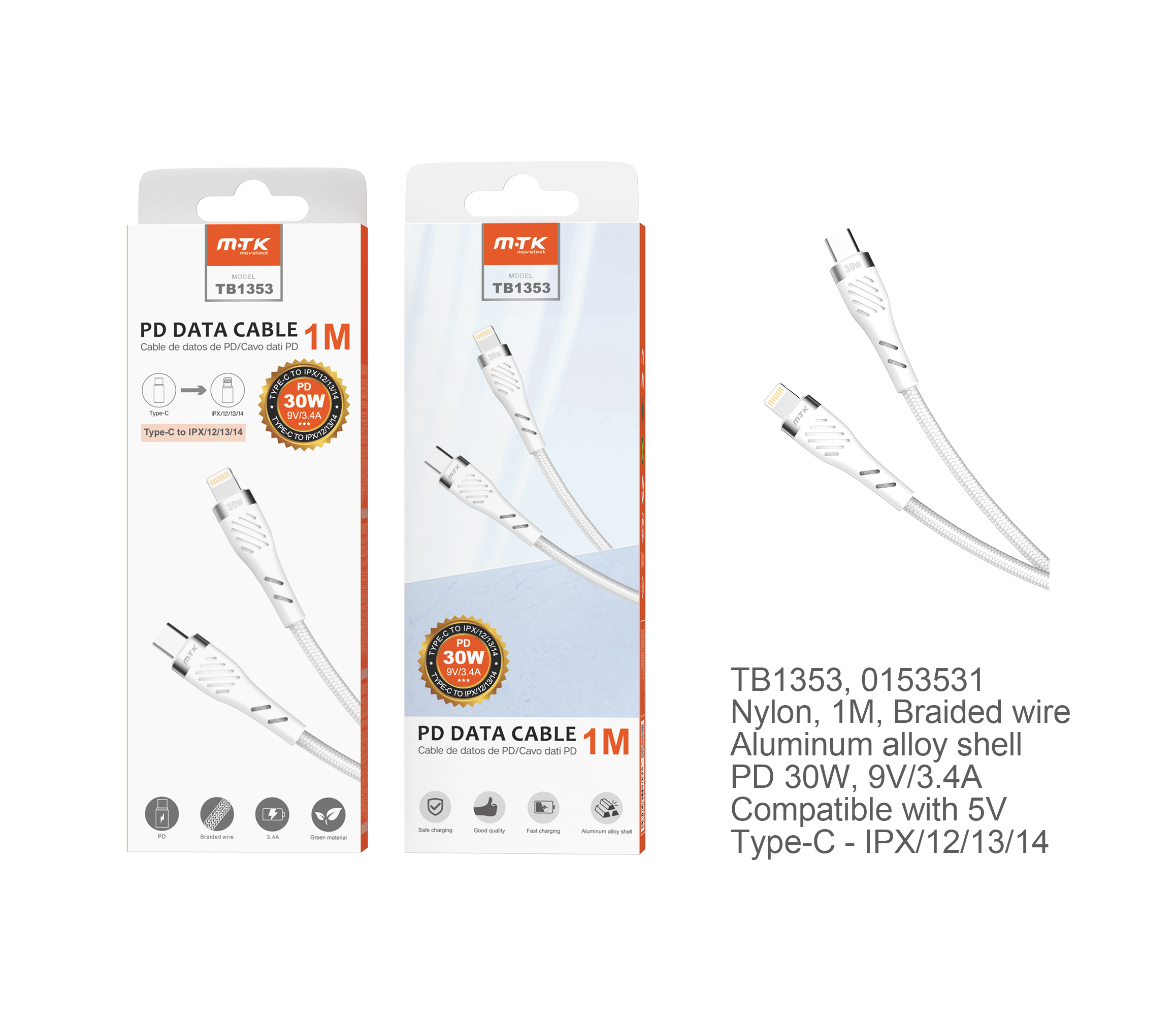 TB1353  BL Cable de Datos Camyl nylon trenzado , Type-C a Lightning , Carga Rapida PD 30W/9V/3.4A , Cable 1M , Blanco