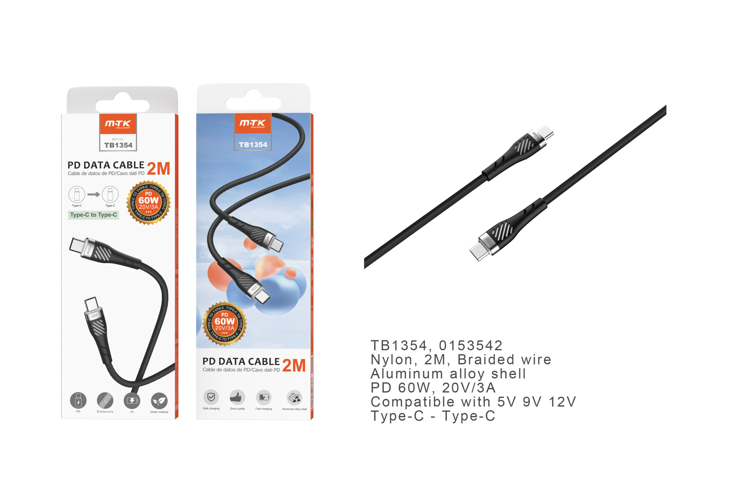 TB1354 NE Cable de datos Camyl nylon trenzado para Type-C a Type-C , Carga Rapida PD, 60W/20V/3A, 2M, Negro
