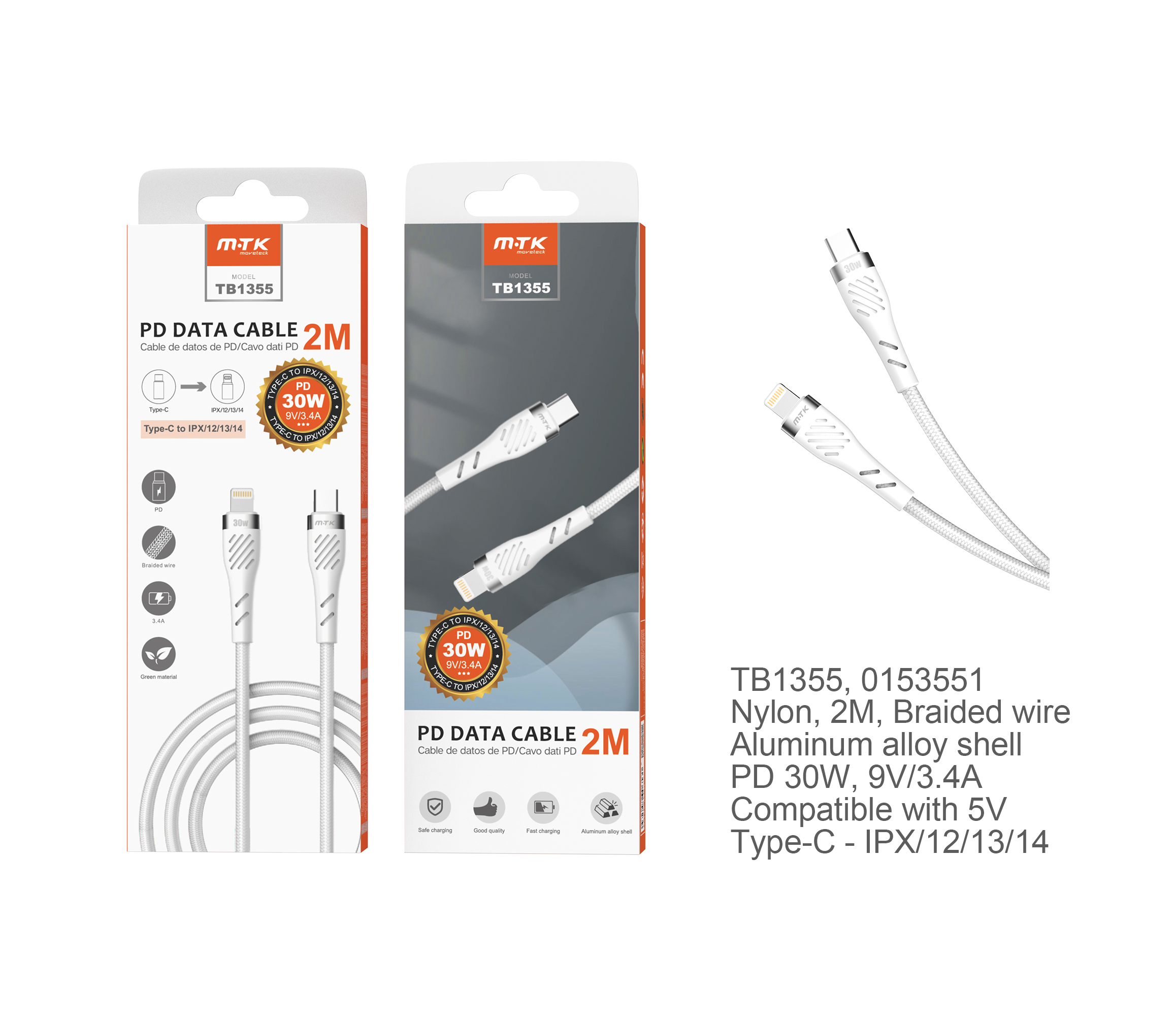 TB1355  BL Cable de Datos Camyl nylon trenzado , Type-C a Lightning , Carga Rapida PD 30W/9V/3.4A , Cable 2M , Blanco
