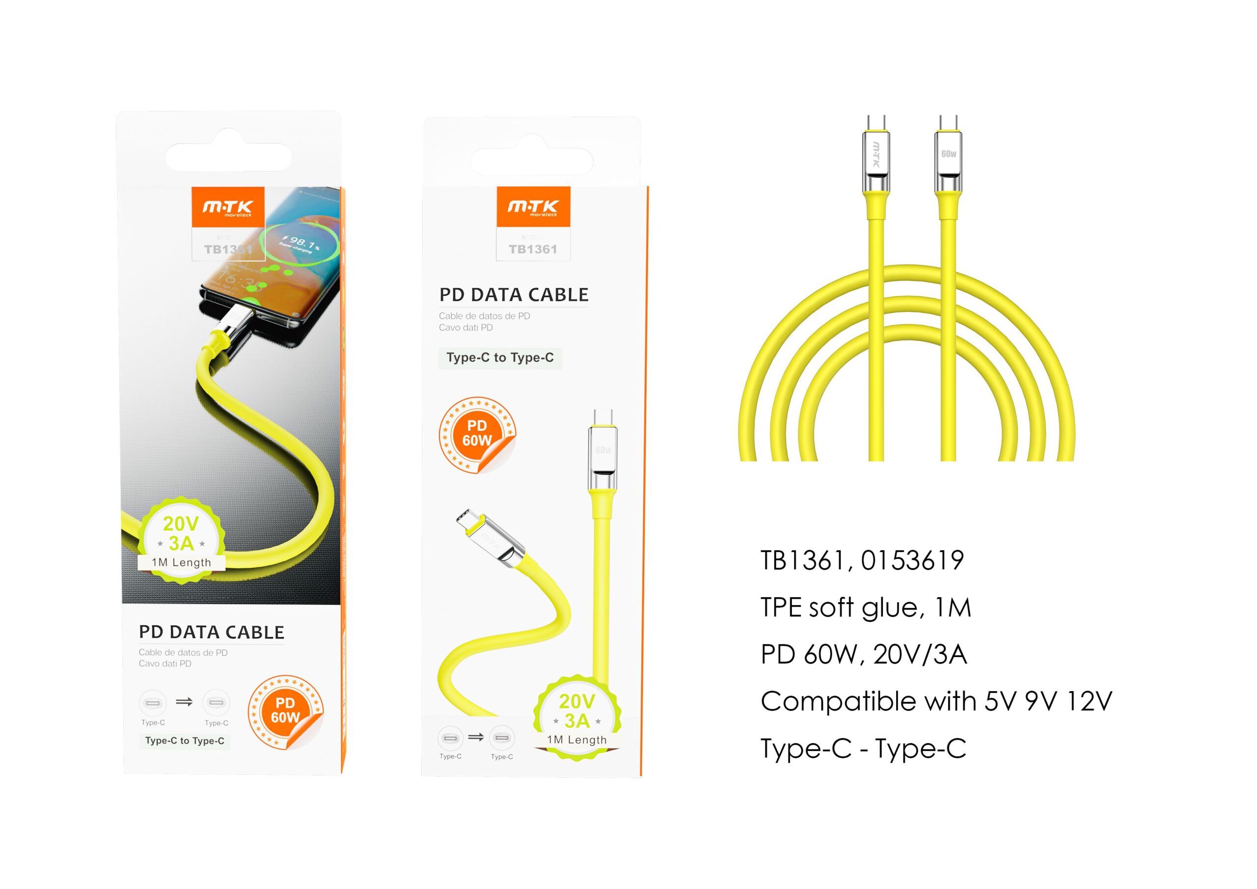 TB1361 AM Cable de datos Cyril para Type-C a Type-C , Carga Rapida PD, 60W/20V/3A, 1M, Amarillo