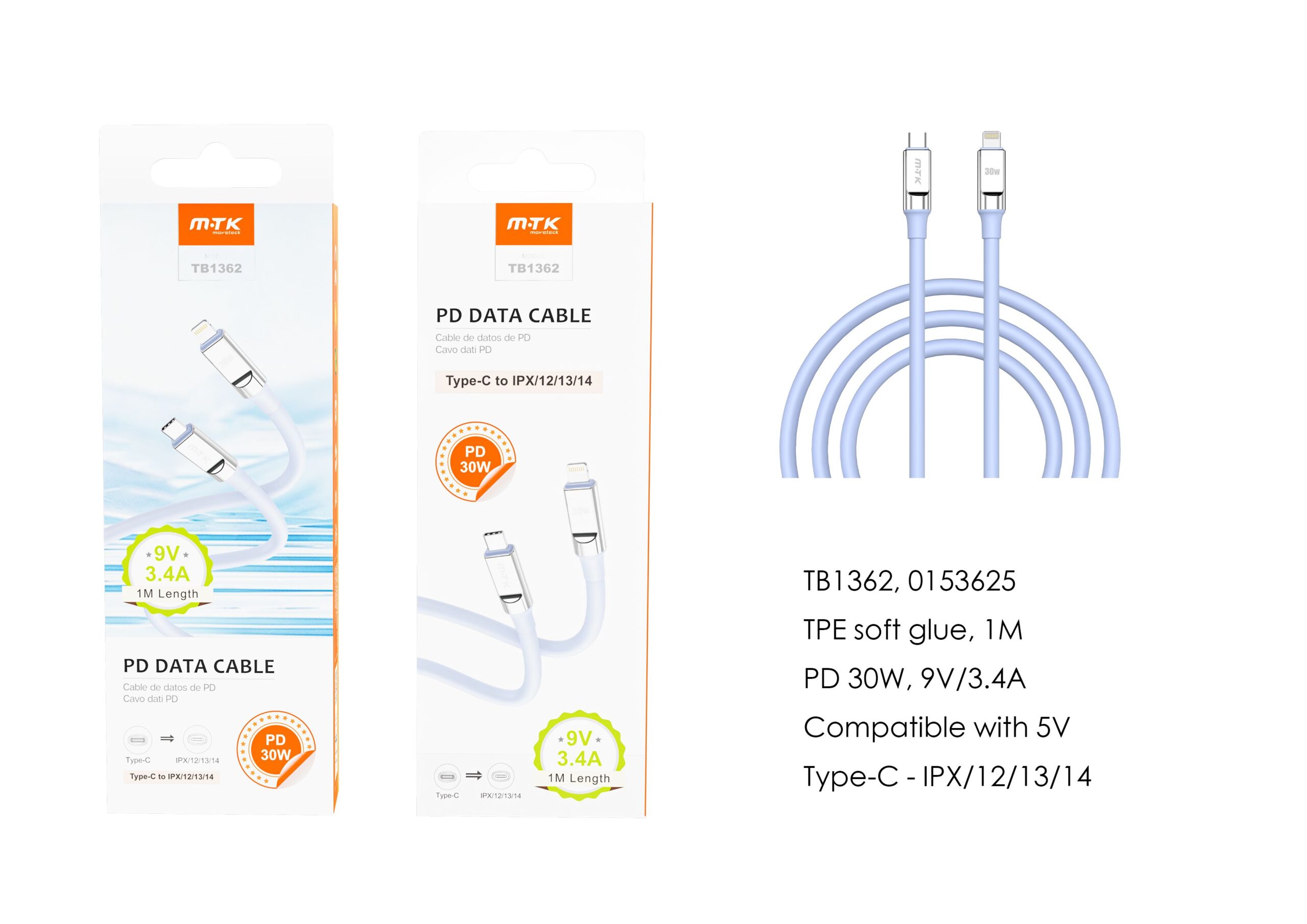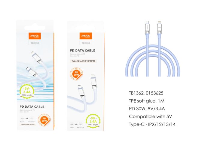 • TB1353 BL Cable de Datos Camyl nylon trenzado , Type-C a Lightning , Carga Rapida PD 30W/9V/3.4A , Cable 1M , Blanco