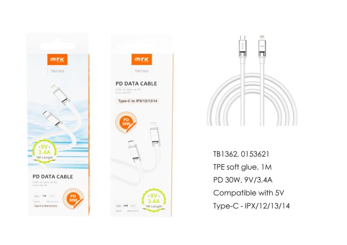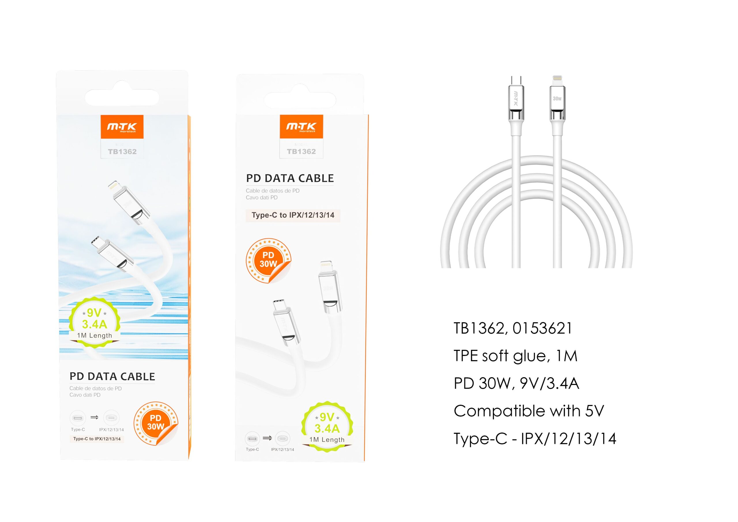 TB1362 BL Cable de datos Cyril para Type-C a Lightning , Carga Rapida PD, 30W/9V/3.4A, 1M, Blanco