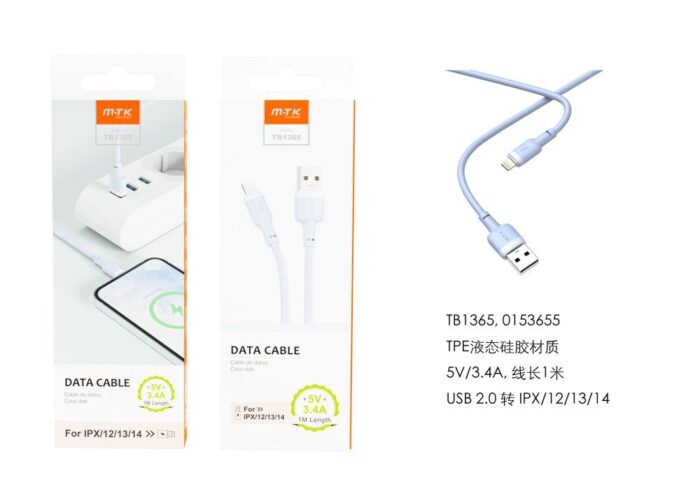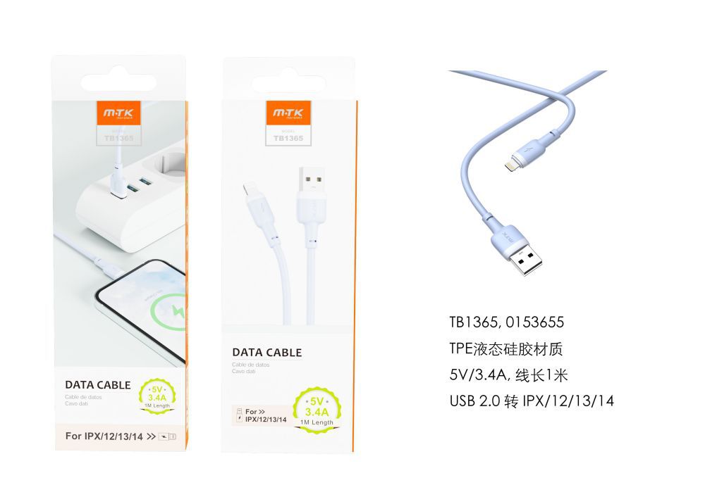 TB1365 AZ Cable de Datos Evie para Iphone 5-14, 1M, 5V/3.4A, Azul