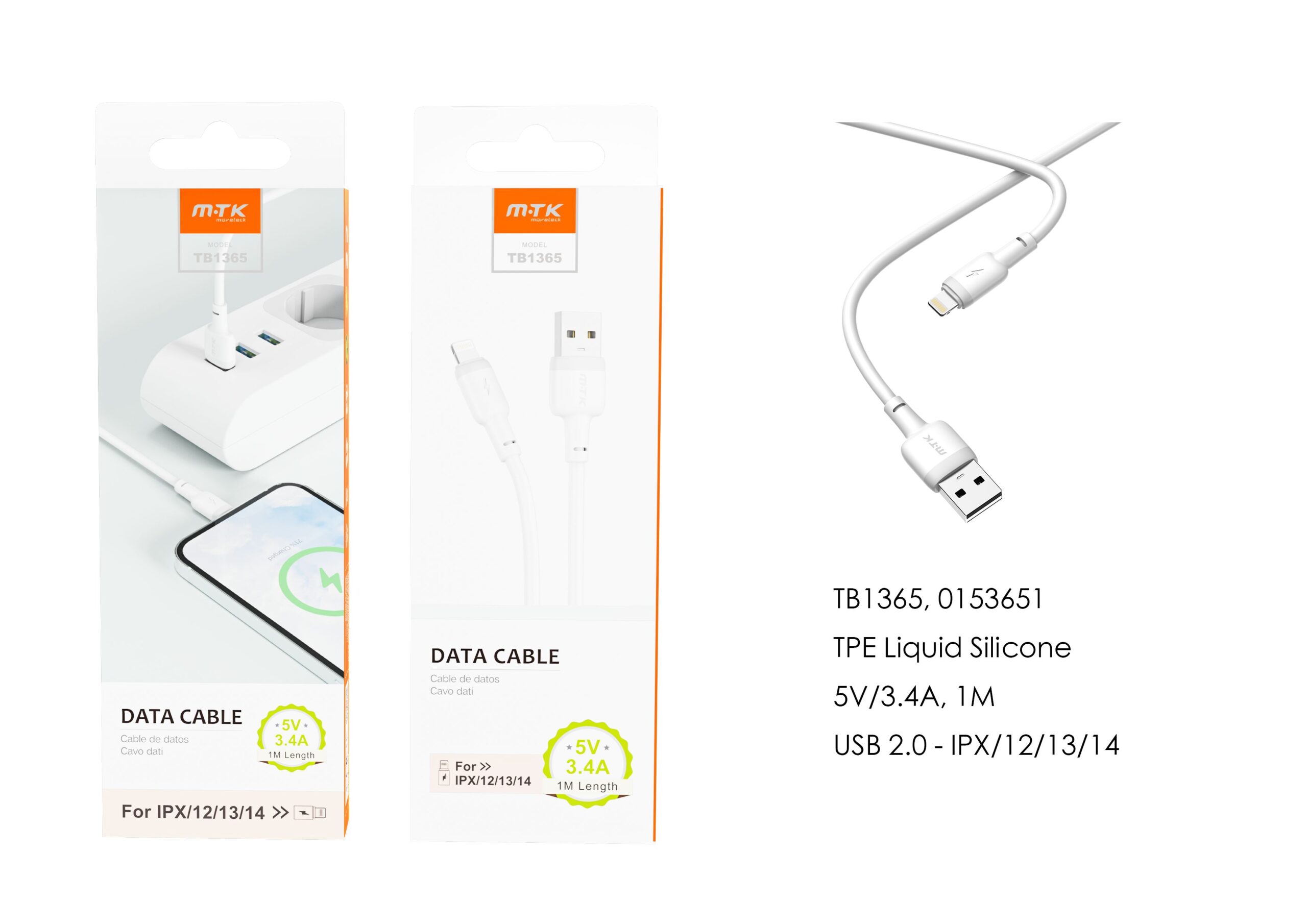 TB1365 BL Cable de Datos Evie para Iphone 5-14, 1M, 5V/3.4A, Blanco