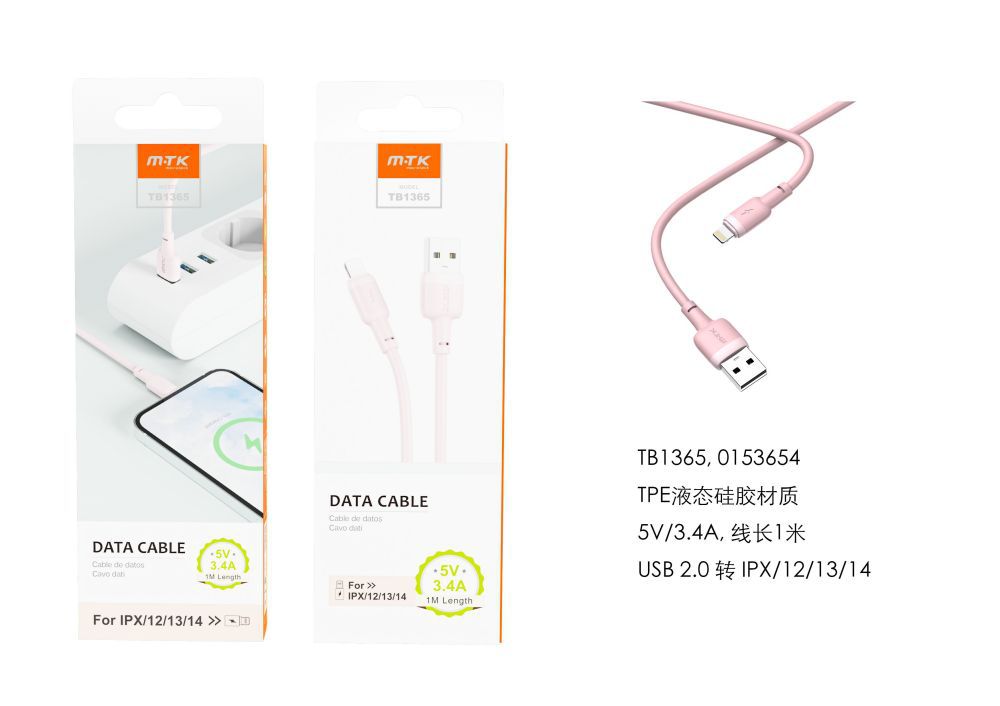 TB1365 RS Cable de Datos Evie para Iphone 5-14, 1M, 5V/3.4A, Rosa