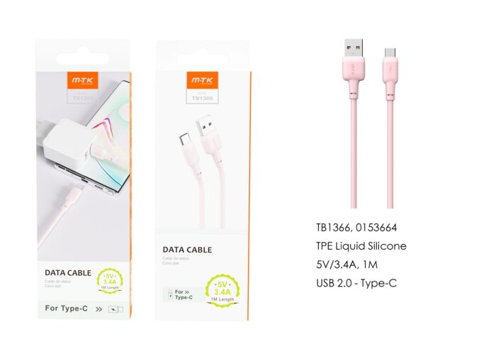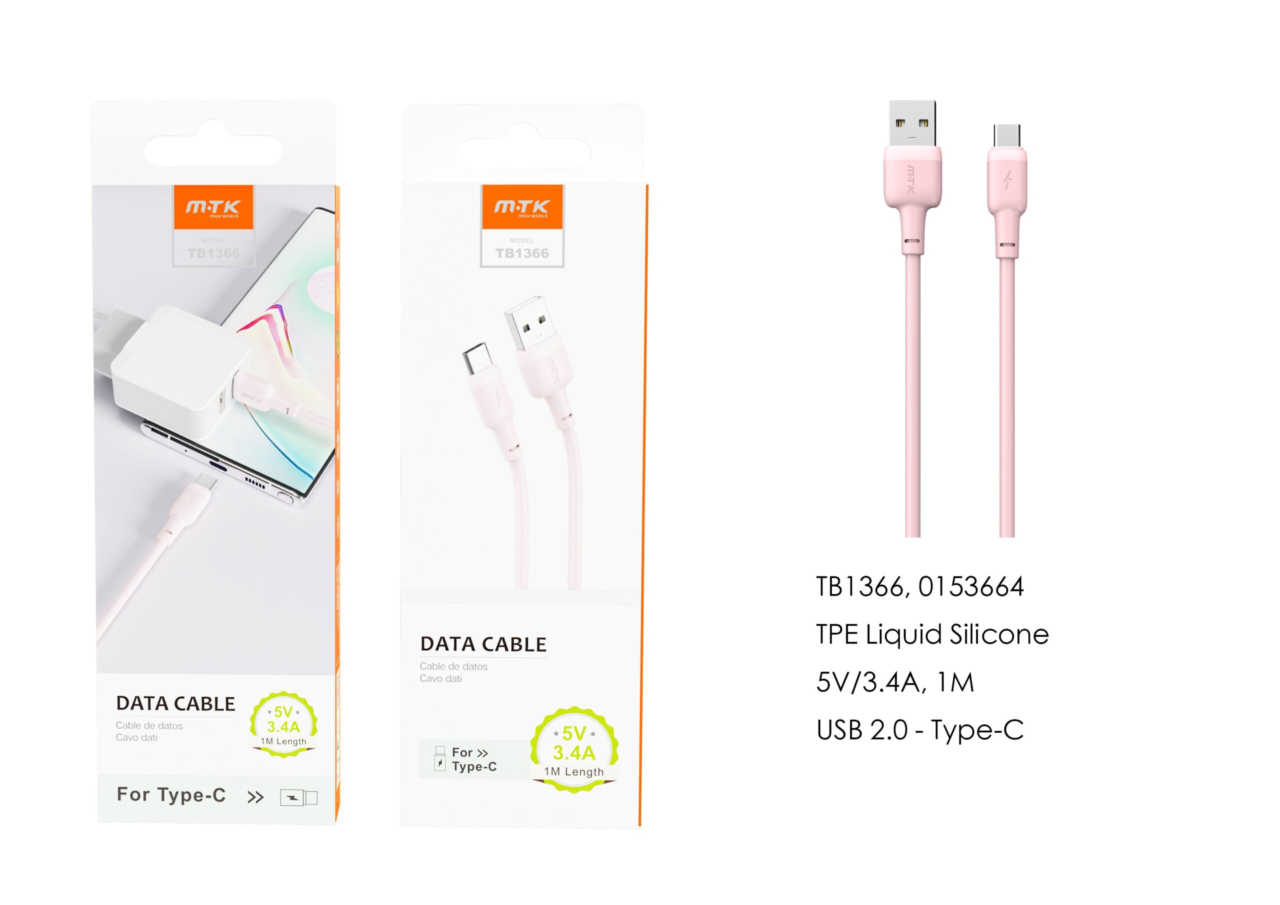 TB1366 RS Cable de Datos Evie para Type-C , 1M, 5V/3.4A, Rosa