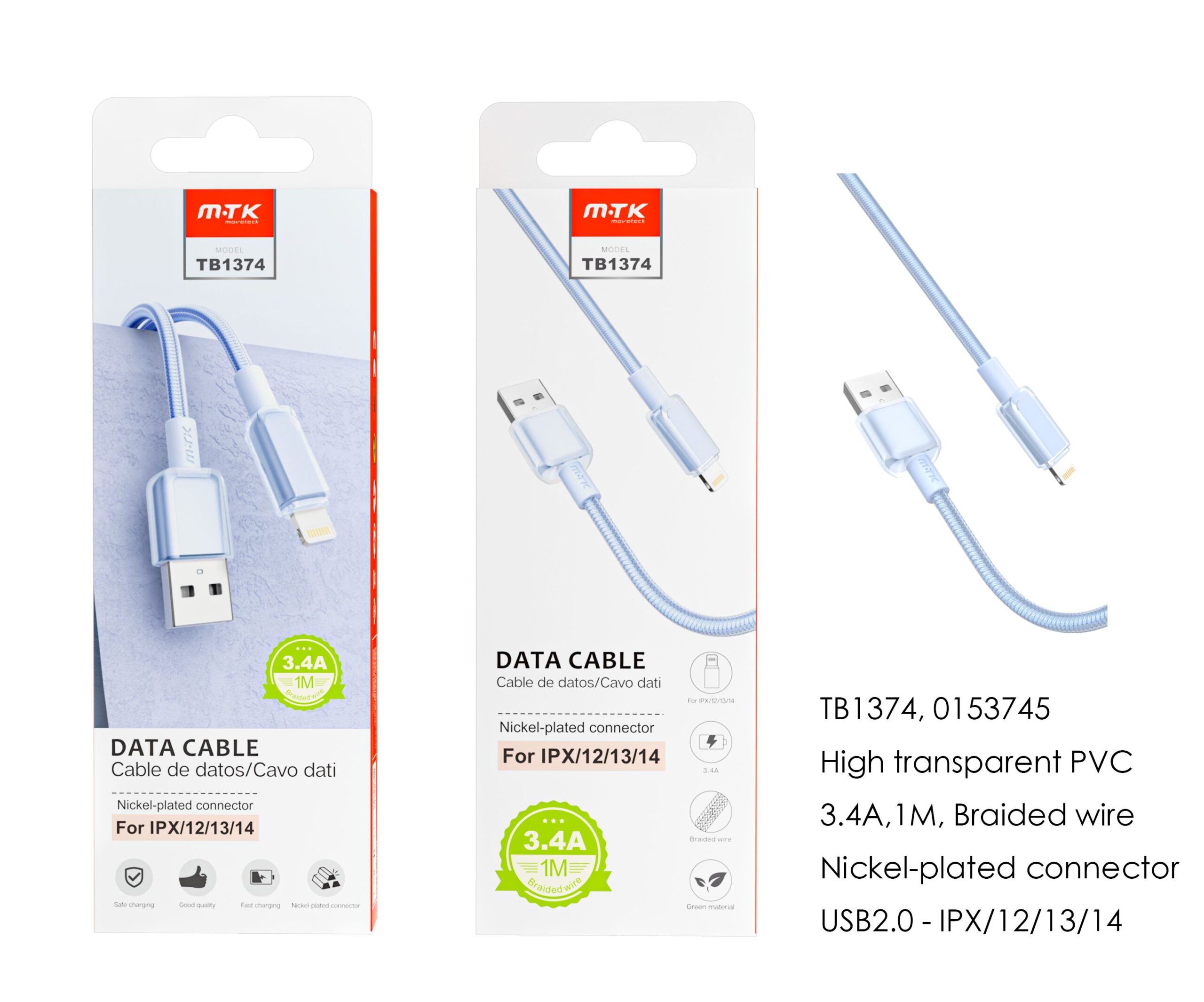 TB1374 AZ Cable de datos Hebe PVC trenzado para Iphone 5-14, 3.4A, 1M, Azul