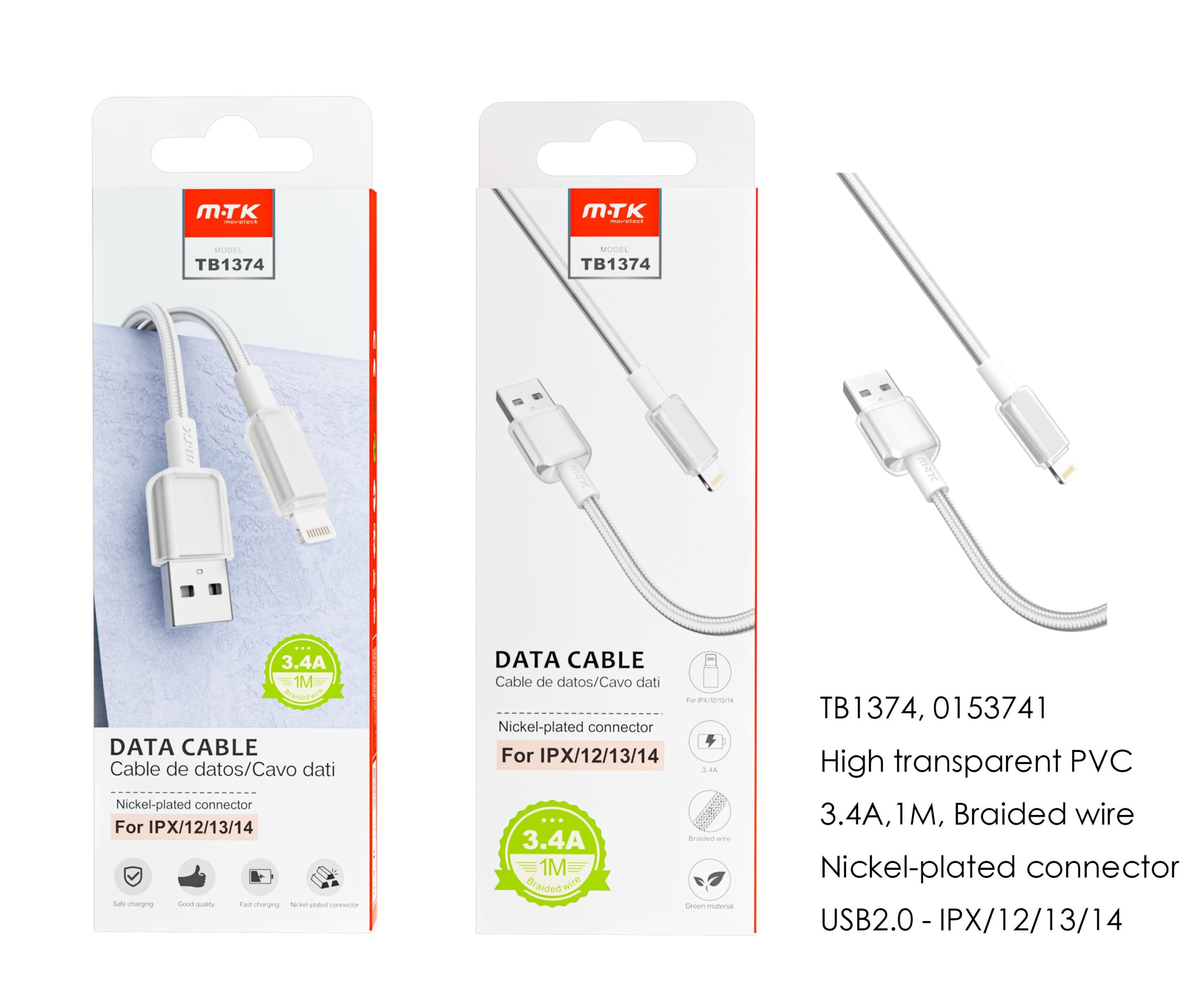 TB1374 BL Cable de datos Hebe PVC trenzado para Iphone 5-14 , 3.4A, 1M, Blanco