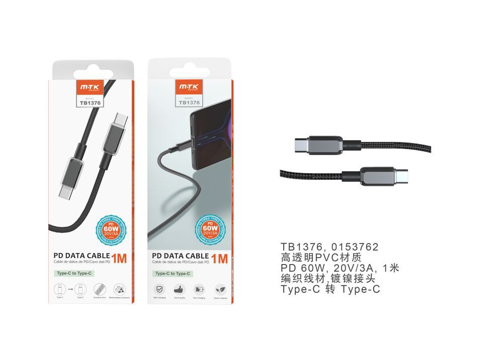 TB1376 NE Cable de datos Hebe PVC trenzado para Type-C a Type-C , Carga Rapida PD,60W/20V/3A, 1M, Negro
