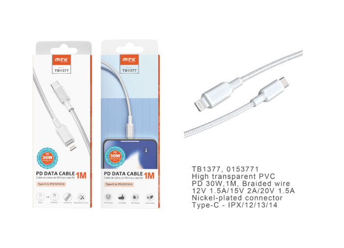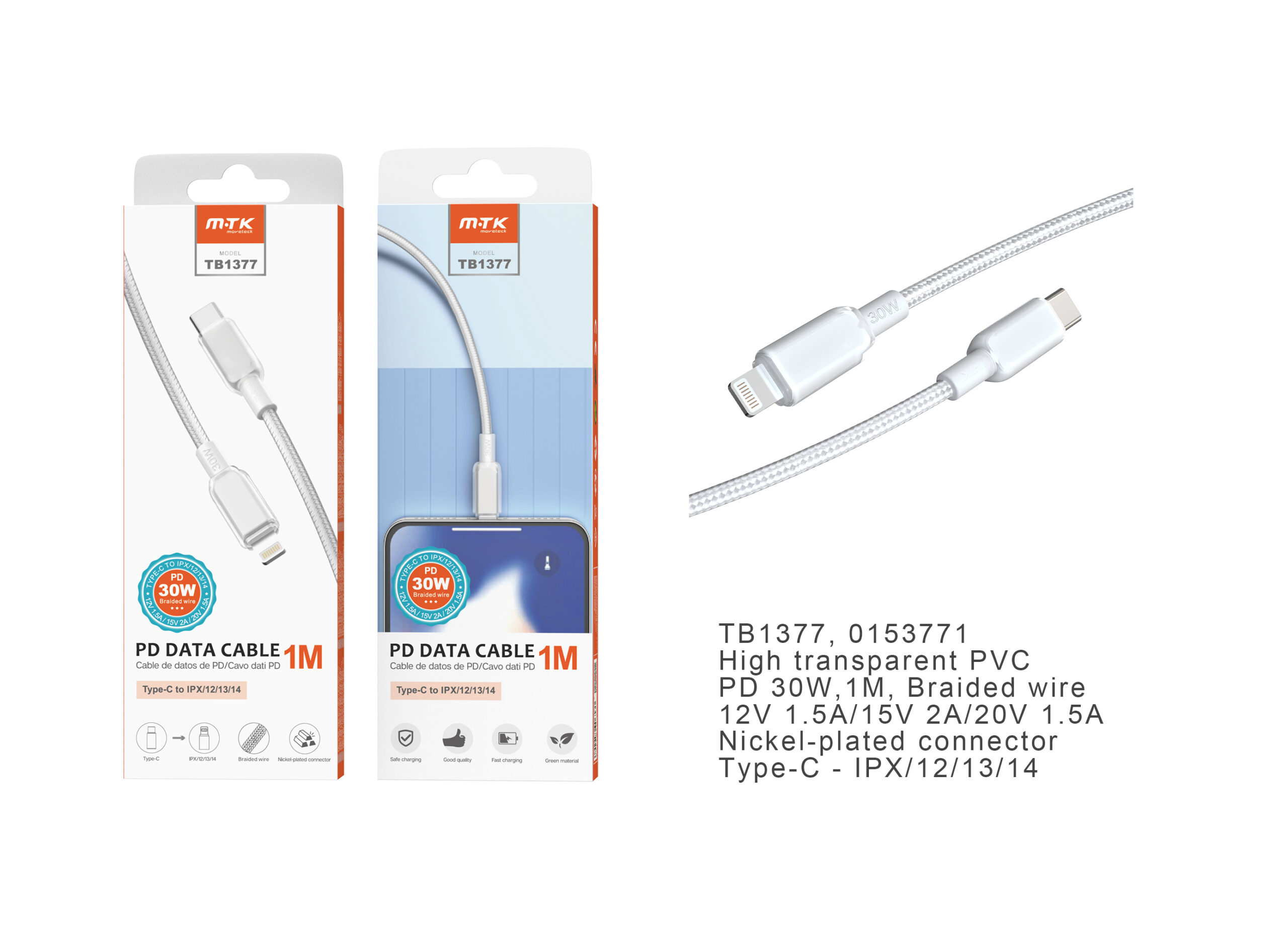 TB1377 BL Cable de datos Hebe PVC trenzado para Type-C a Lightning , Carga Rapida PD, 30W/12V/2.5A, 1M, Blanco