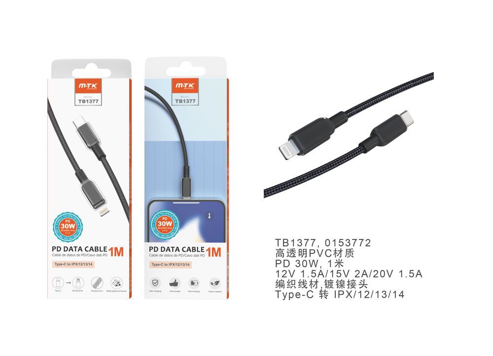 TB1377 NE Cable de datos Hebe PVC trenzado para Type-C a Lightning , Carga Rapida PD, 30W/12V/2.5A, 1M, Negro