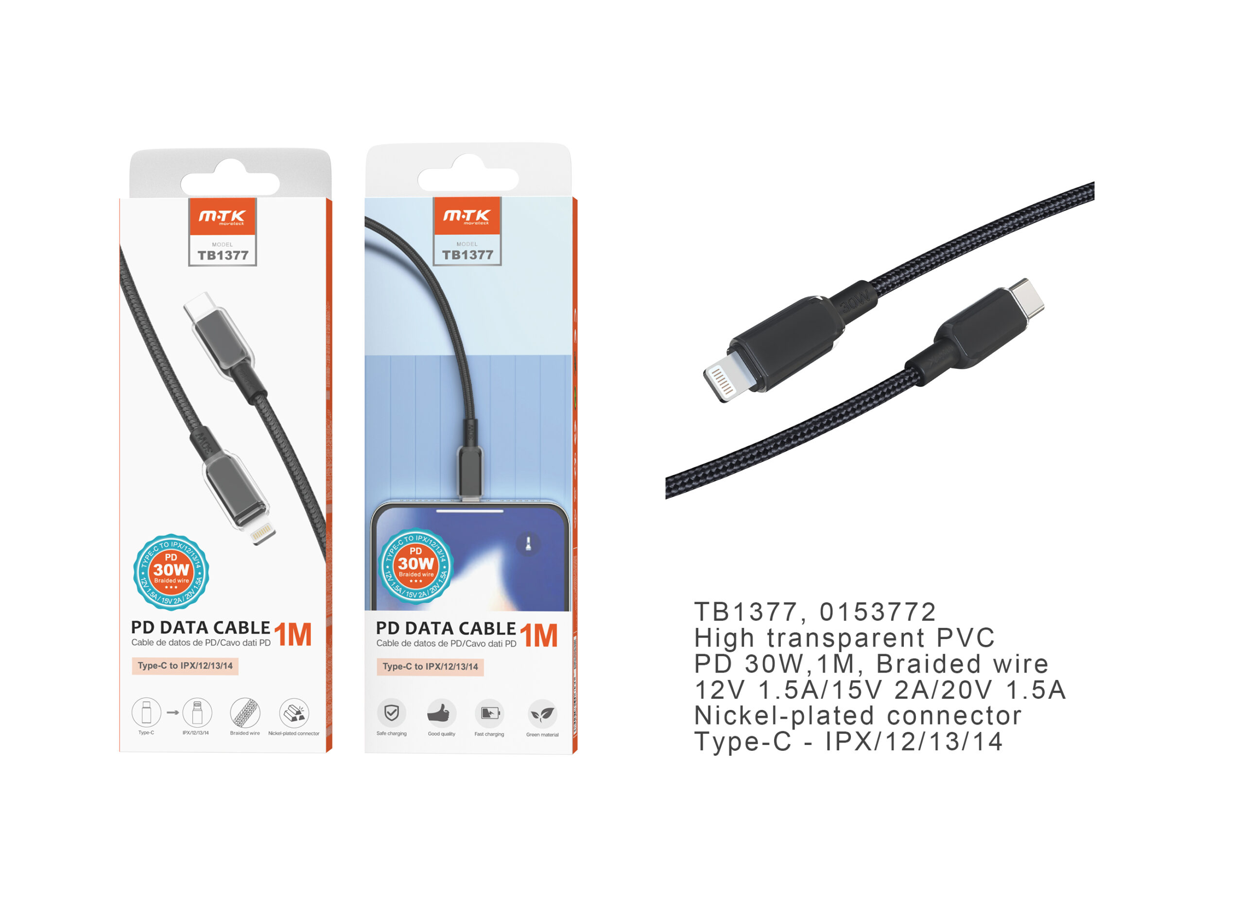 TB1377 NE Cable de datos Hebe PVC trenzado para Type-C a Lightning , Carga Rapida PD, 30W/12V/2.5A, 1M, Negro