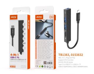 TB1383 NE lector TYPE-C Hub 4 en 1, 2* USB2.0 +1*USB3.0 +TF, Compatible con OTG, 24.5CM, Negro