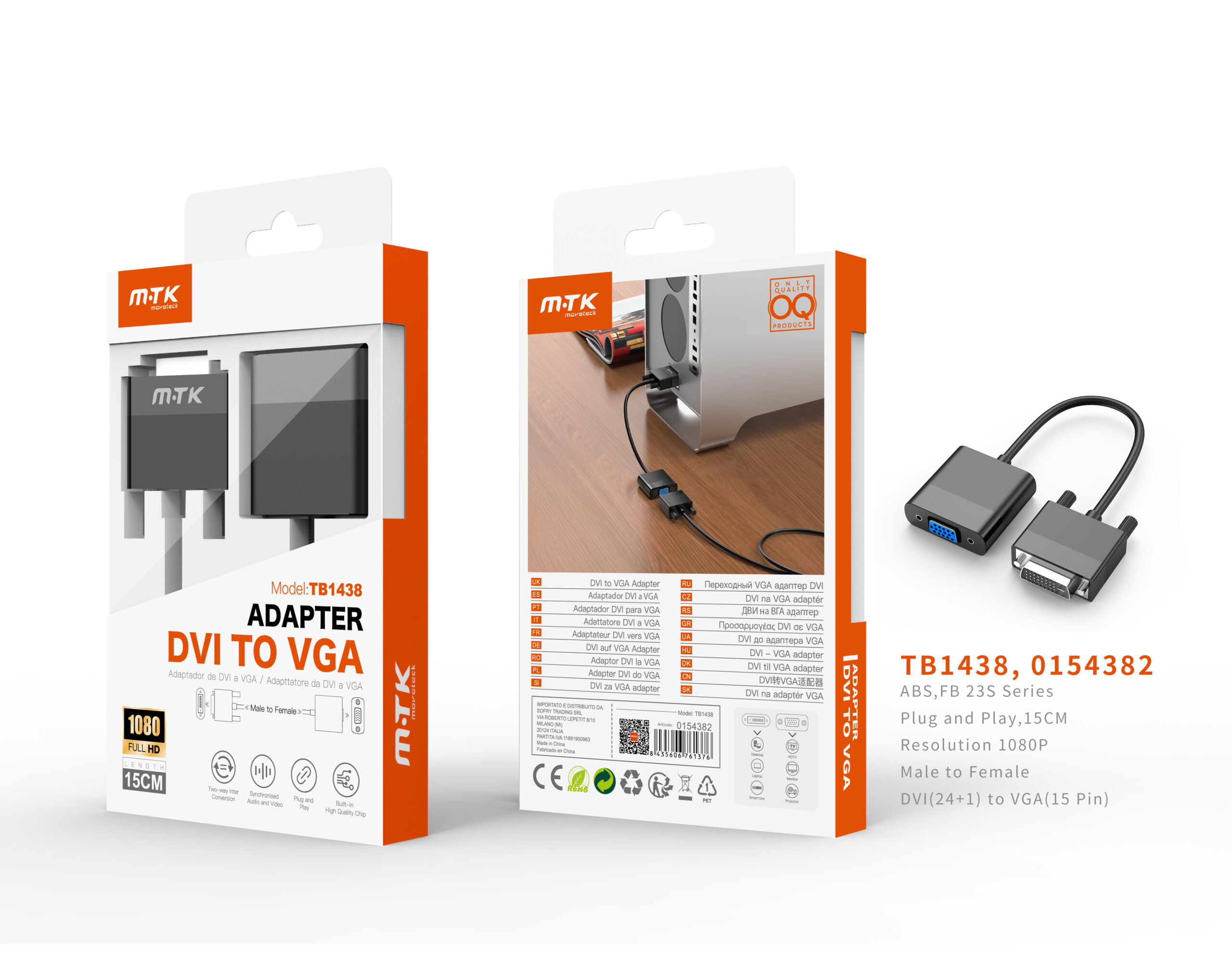 TB1438 NE Adaptador DVI 24+1(Macho) a VGA 15Pin(Hembra),1080P, 15CM, Negro