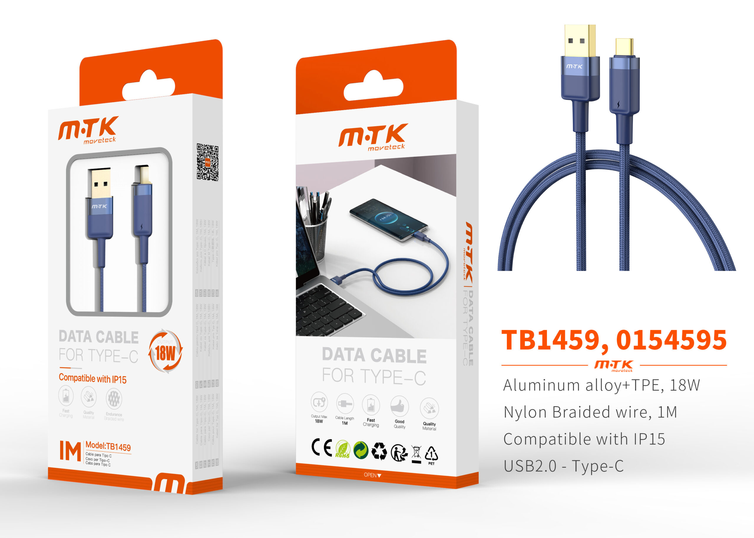 TB1459 AZ Luxury Cable de datos Silas nylon trenzado para Type-C , 5V/3.4A, 1M, Azul