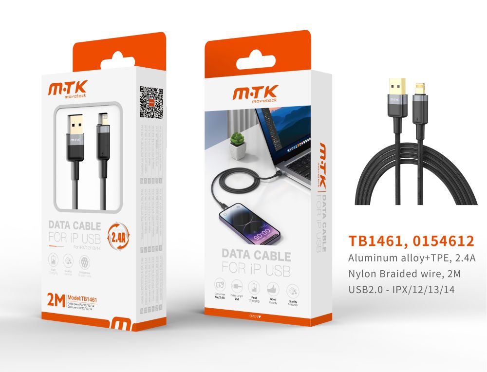 TB1461 NE Luxury Cable de datos Silas nylon trenzado para Iphone 5-14 , 5V/2.4A, 2M, Negro