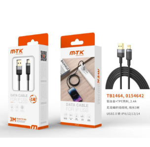 TB1464 NE Luxury Cable de datos Silas nylon trenzado para Iphone 5-14 , 5V/2.4A, 3M, Negro