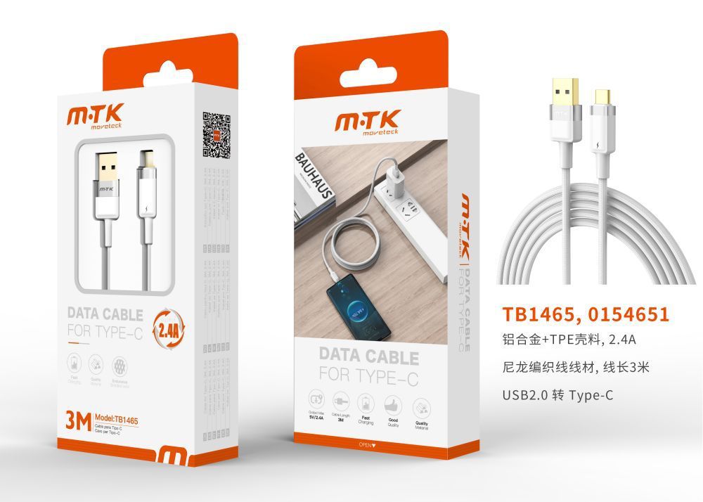 TB1465 BL Luxury Cable de datos Silas nylon trenzado para Type-C , 2.4A, 3M, Blanco
