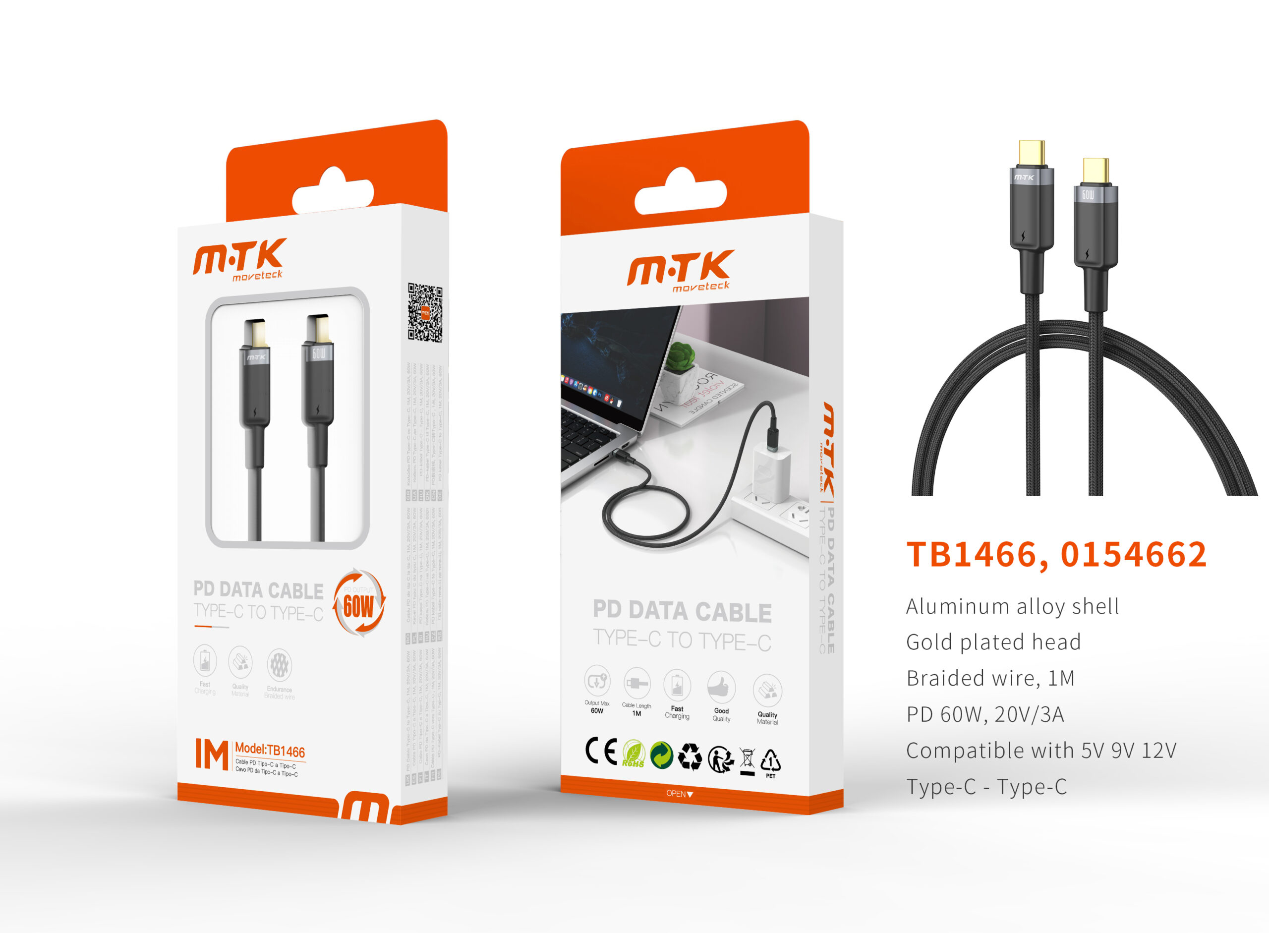 TB1466 NE Luxury Cable de datos Silas nylon trenzado para Type-C a Type-C , Carga Rapida PD,60W/20V/3A, 1M, Negro