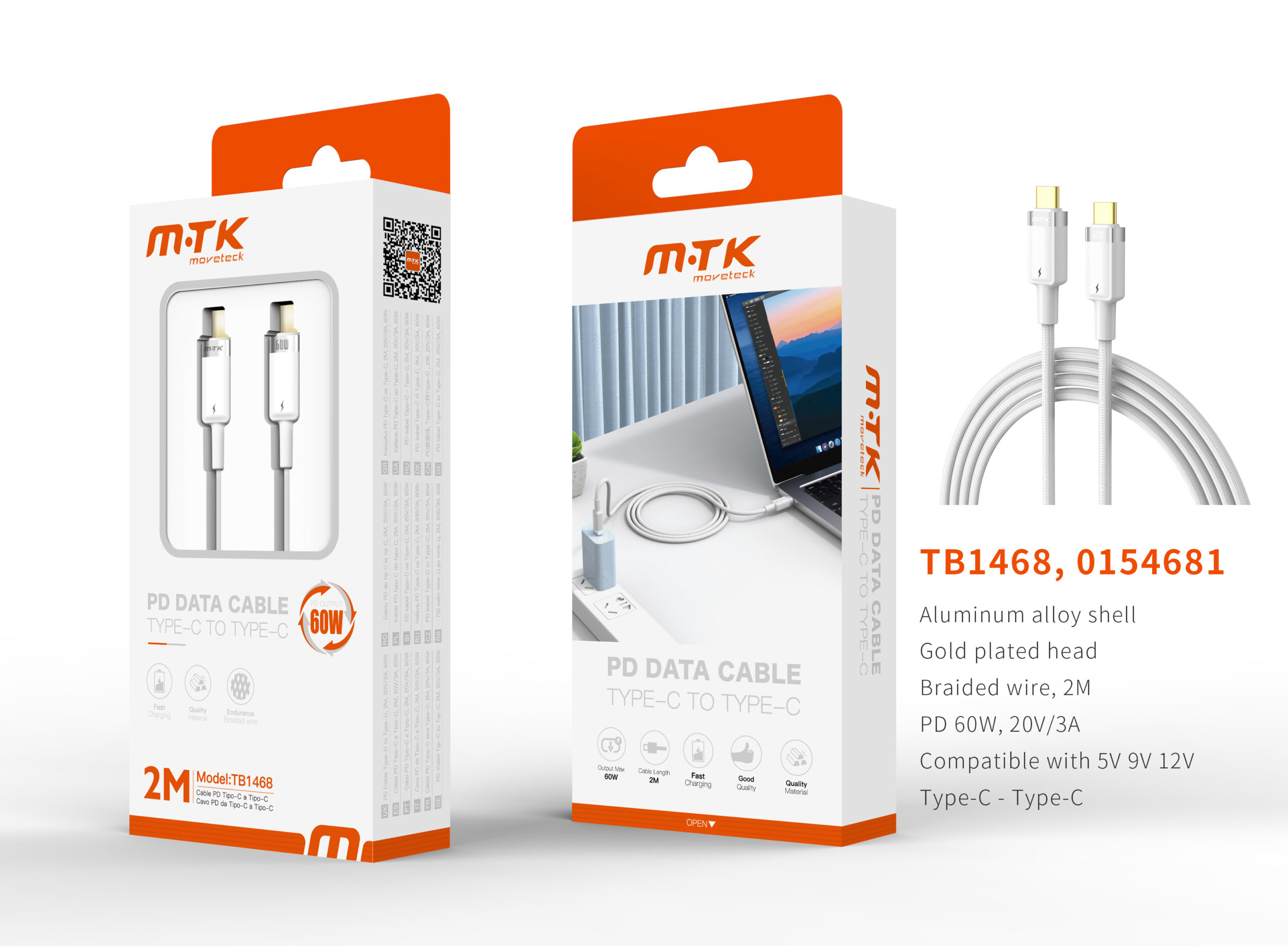 TB1468 BL Luxury Cable de datos Silas nylon trenzado para Type-C a Type-C ,Carga Rapida PD 60W/20V/3A, 2M, Blanco